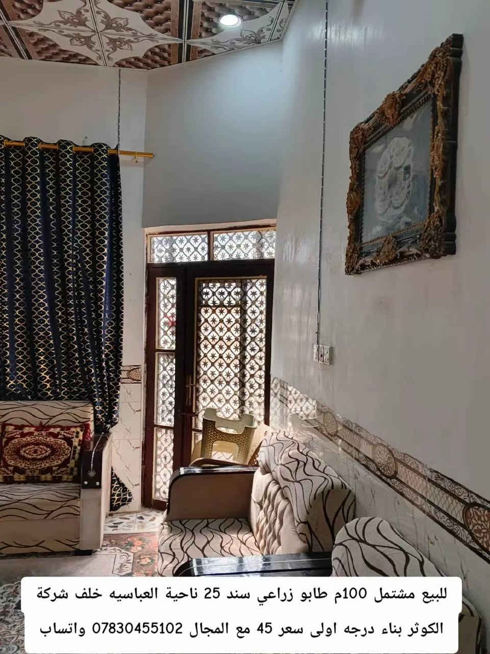 للبيع مشتمل 100م خلف شركة الكوثر طابو زراعي غرفه صاله مطبخ ستقبال بناء درجه اولى سعر45 بي مجال *********** واتساب
