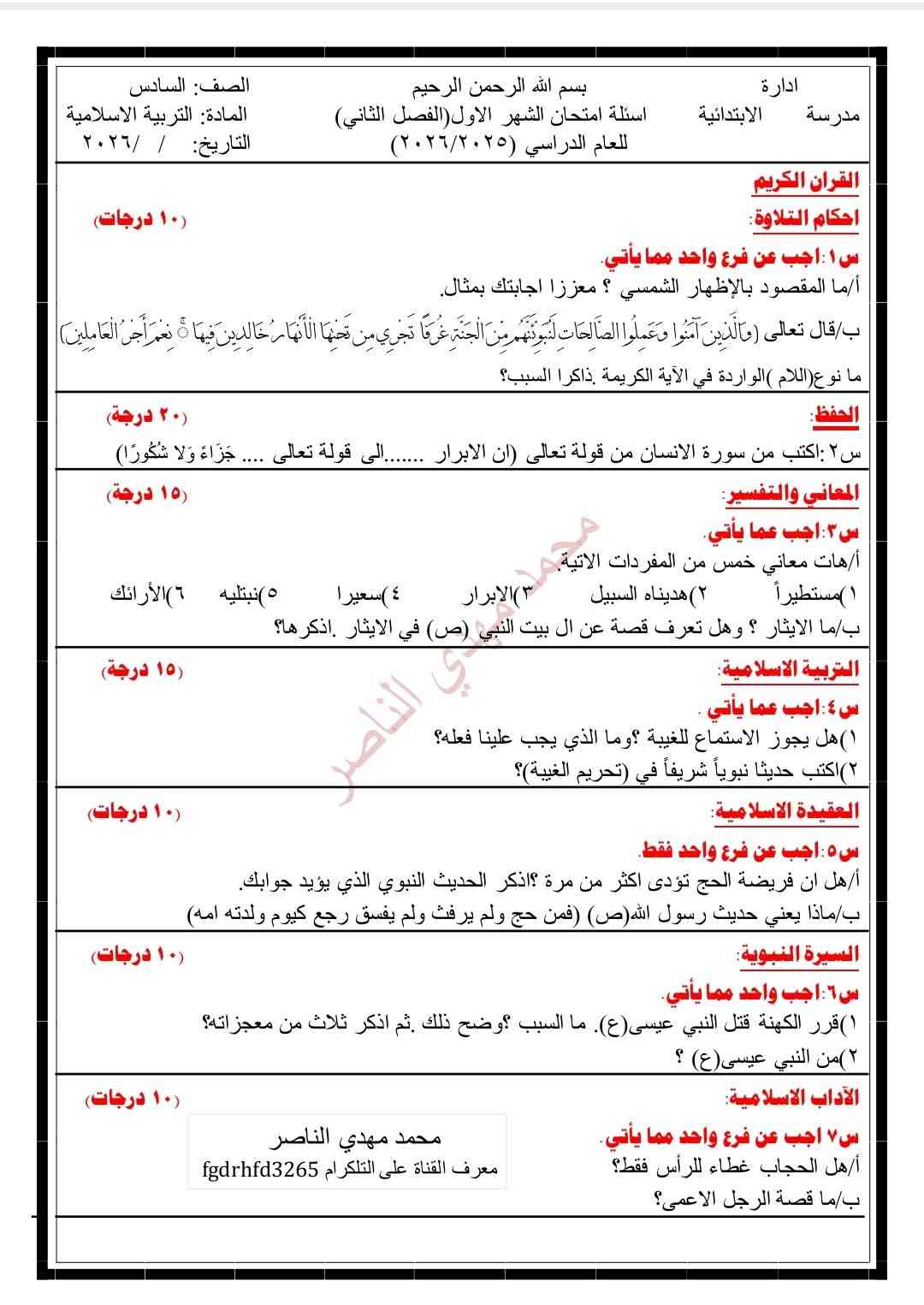 نموذج اسئلة التربية الاسلامية الصف السادس ابتدائي الفصل الثاني (الشهر الاول) وجميع الاسئلة تجدونها على قناتنا على التليكرام في الرابط ادناه https://t.me/fgdrhfd3265 **إذا كنت صاحب هذا الإعلان وتريد حذفه لأي سبب، رجاءا أرسل رسالة إلى الدعم الفني**