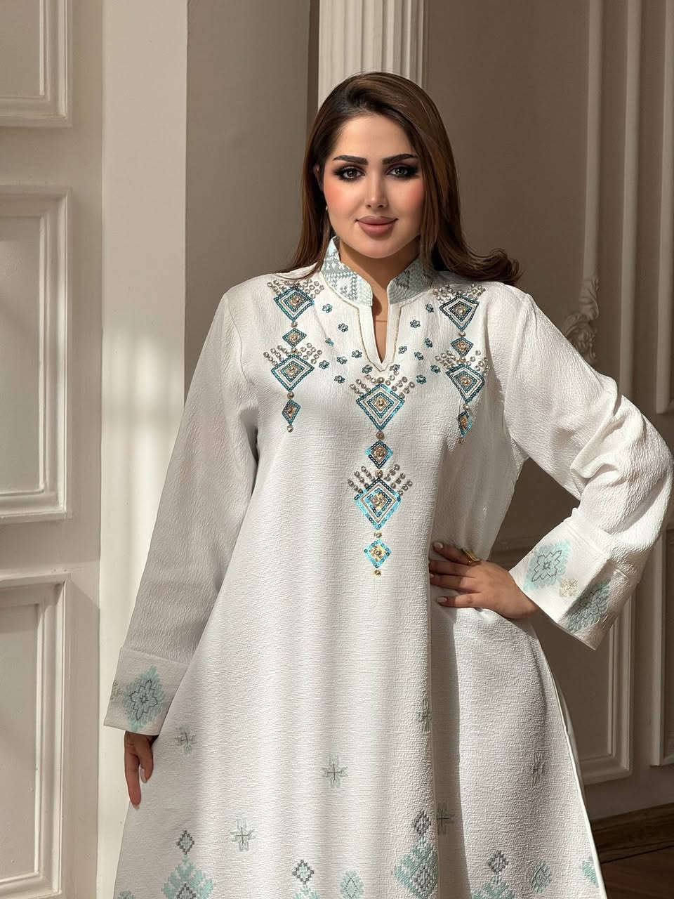 دشداشة نسائي • قطن مراسي مصري • تطريز ستراس