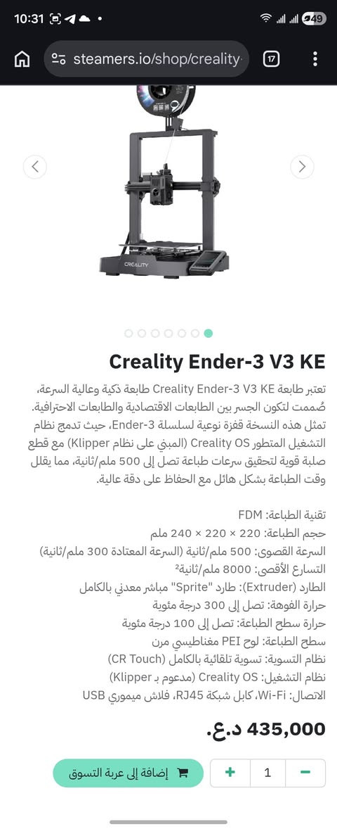 طابعة للبيع CREALITY ender3 V3 KE جديدة استعمال ساعة وحده فقط ٤٠٠ الف مع التوصيل متوفر توصيل لبغداد و باقي المحافظات **إذا كنت صاحب هذا الإعلان وتريد حذفه لأي سبب، رجاءا أرسل رسالة إلى الدعم الفني**