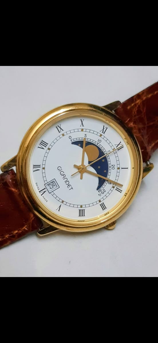 تحية طيبة #Gigandet_moon_Phase_Vintage_1990 . إنتاج سويسري قديم فنتج كوارتز . تتميز بتعقيد اطوار ومراحل القمر مون فيس أرقام روماني قطر 34mm ملم بدون الزمبلك . النظافة تامة . شحن وتوصيل لكافة المحافظات . **إذا كنت صاحب هذا الإعلان وتريد حذفه لأي سبب، رجاءا أرسل رسالة إلى الدعم الفني**