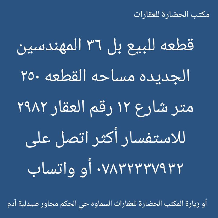 #للبيع #قطعه #بل٣٦ #المهدسين نستقبل جميع العروض العقاريه والتجاريه على الواتساب *********** // واتساب *********** // اتصال أو زيارة المكتب الحضارة للعقارات السماوه حي الحكم مجاور صيدلية آدم