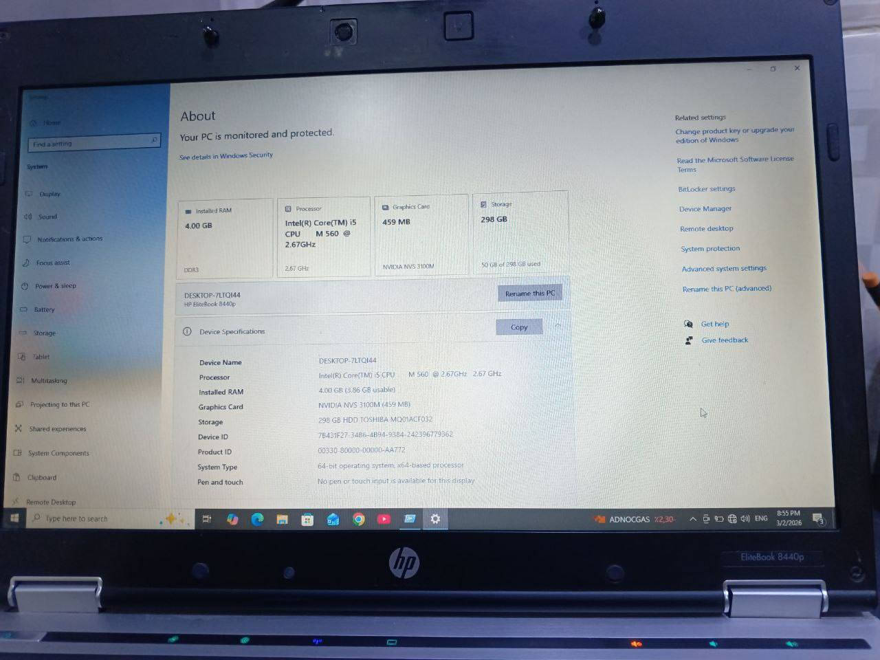 سلام عليكم لابتوب hp يرهم دراسة وتصفح ويا جميع برامج مايكروسوف الموديل: HP EliteBook 8440p اسم الجهاز: DESKTOP-7LTQ144 المعالج (CPU) Intel Core i5 M 560 الرام (RAM) 4.00 GB DDR3 قابل للتطوير كرت الشاشة NVIDIA NVS 3100M الذاكرة: 459 MB التخزين 298 GB قابل للتطوير 🪟 نظام التشغيل Windows 10 Pro الإصدار: 22H2 نظيف ويا ماوس وكيبورد وكيبل في جي اي وكيبل مال نت السعر 170الف وبي مجال للشراي وياهدية للتواصل ***********