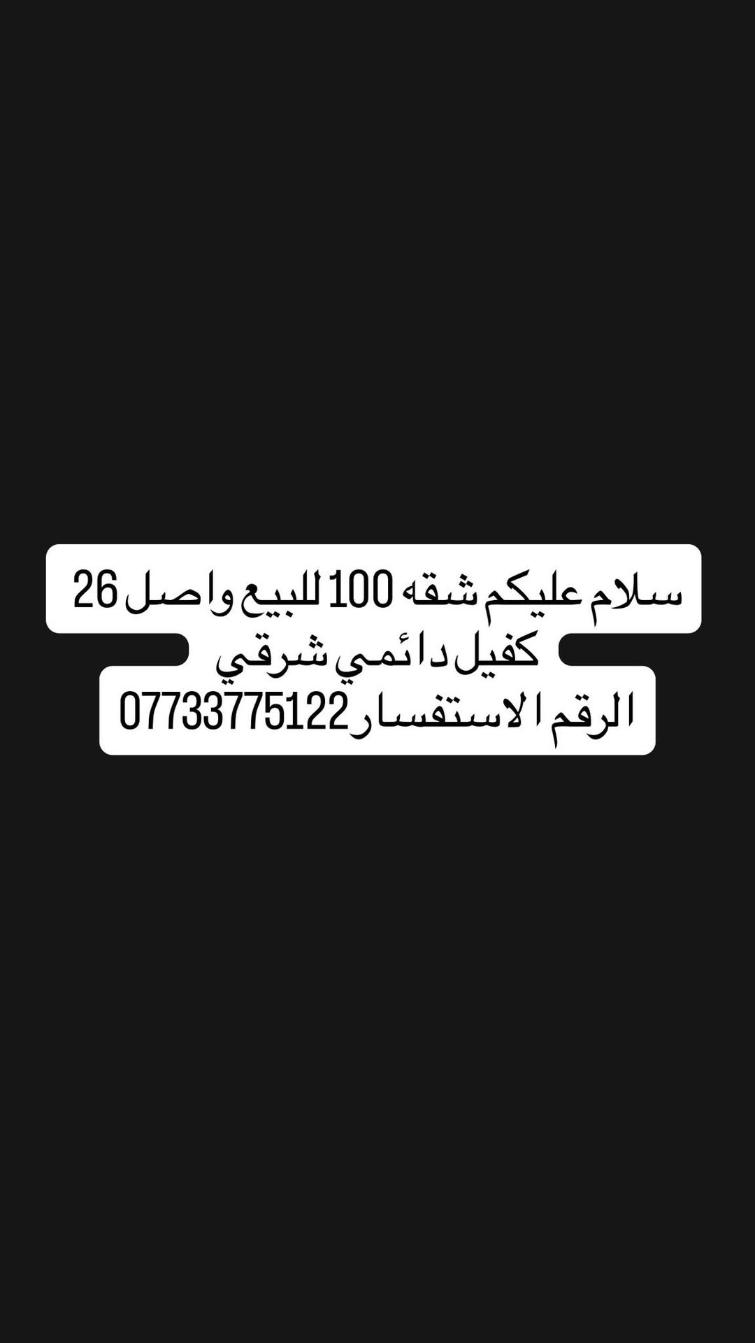 سلام عليكم شقه 100 للبيع واصل 26 كفيل دائمي شرقي الرقم الاستفسار***********