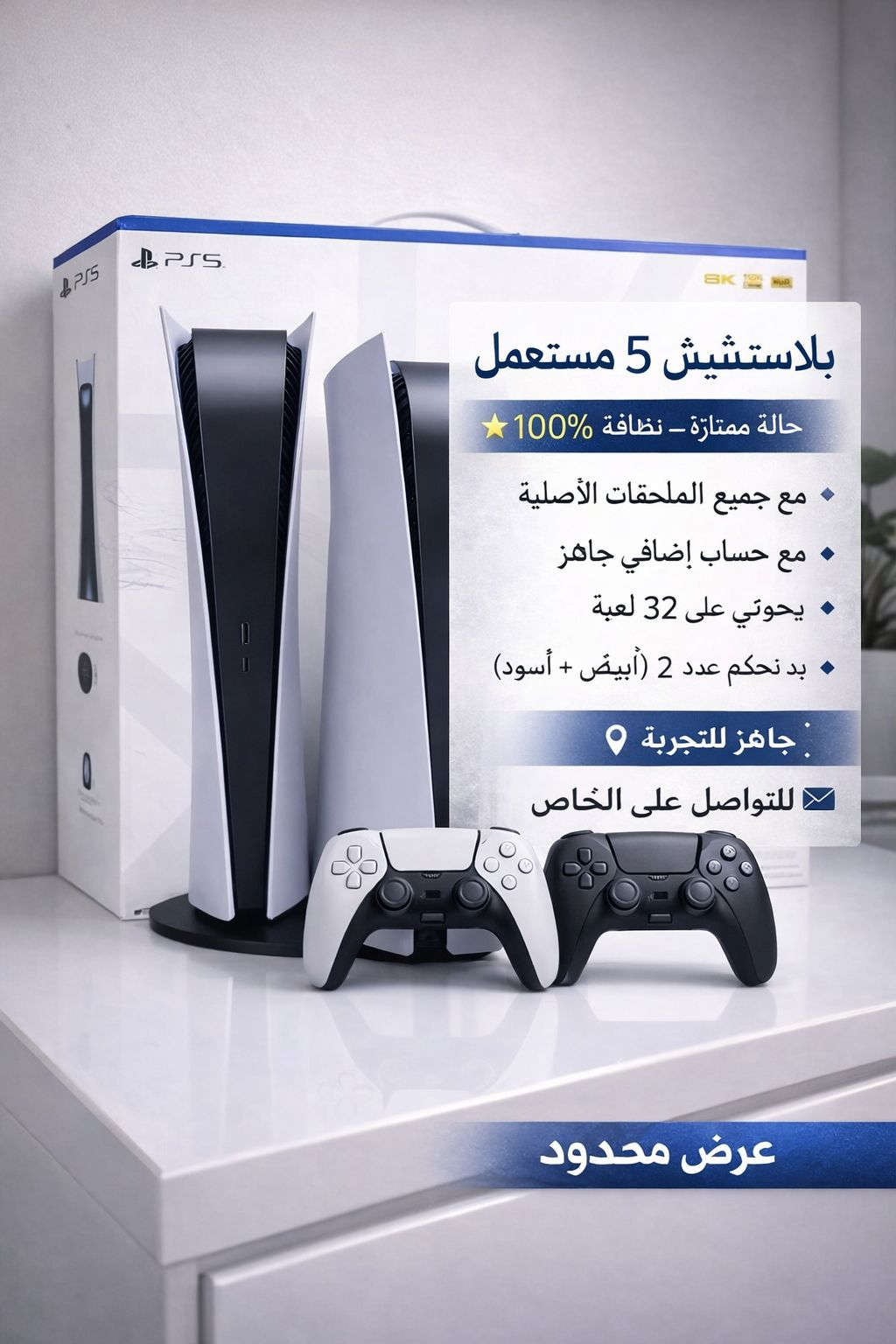 بلي 5 مستعمل نضافه 100 مع 32 لعبه داخل جهاز + يده اضافيه وكامل ملحقاته اصليه سعر 610 0786 377 9288