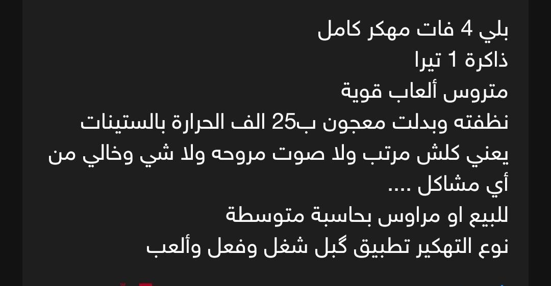 بلي 4 فات مهكر 1 تيرا تفاصيل بالصورة ... سعر 260 الف كامل مكمل من برامج وألعاب ومنظف ومخليلة معجون حرارة مستقرة وصوت مروحة خفيف .. مع جوستك والكيبلات **إذا كنت صاحب هذا الإعلان وتريد حذفه لأي سبب، رجاءا أرسل رسالة إلى الدعم الفني**
