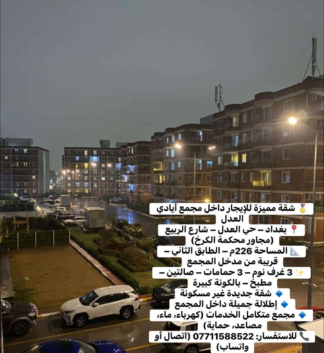 🏅 شقة مميزة للإيجار داخل مجمع أيادي العدل مساحة 226م اربع غرف نوم 🛌 📍 بغداد – حي العدل – شارع الربيع (مجاور محكمة الكرخ) 📐 المساحة 226م – الطابق الثاني – قريبة من مدخل المجمع ✨ 4 غرف نوم – 3 حمامات – صالتين – مطبخ – بالكونة كبيرة 🔹 شقة جديدة غير مسكونة 🔹 إطلالة جميلة داخل المجمع 🔹 مجمع متكامل الخدمات (كهرباء، ماء، مصاعد، حماية) 📞 للاستفسار: *********** (اتصال أو واتساب) #بغداد #الكرخ #حي_العدل #شارع_الربيع #مجمع_ايادي_العدل #عقارات_بغداد #شقق_للايجار #شقق_بغداد #سكن_بغداد #عروض_عقارية #ايجار #استثمار_عقاري #الموظفين #موظفي_الدولة #الاطباء #المهندسين #بغداد_الان