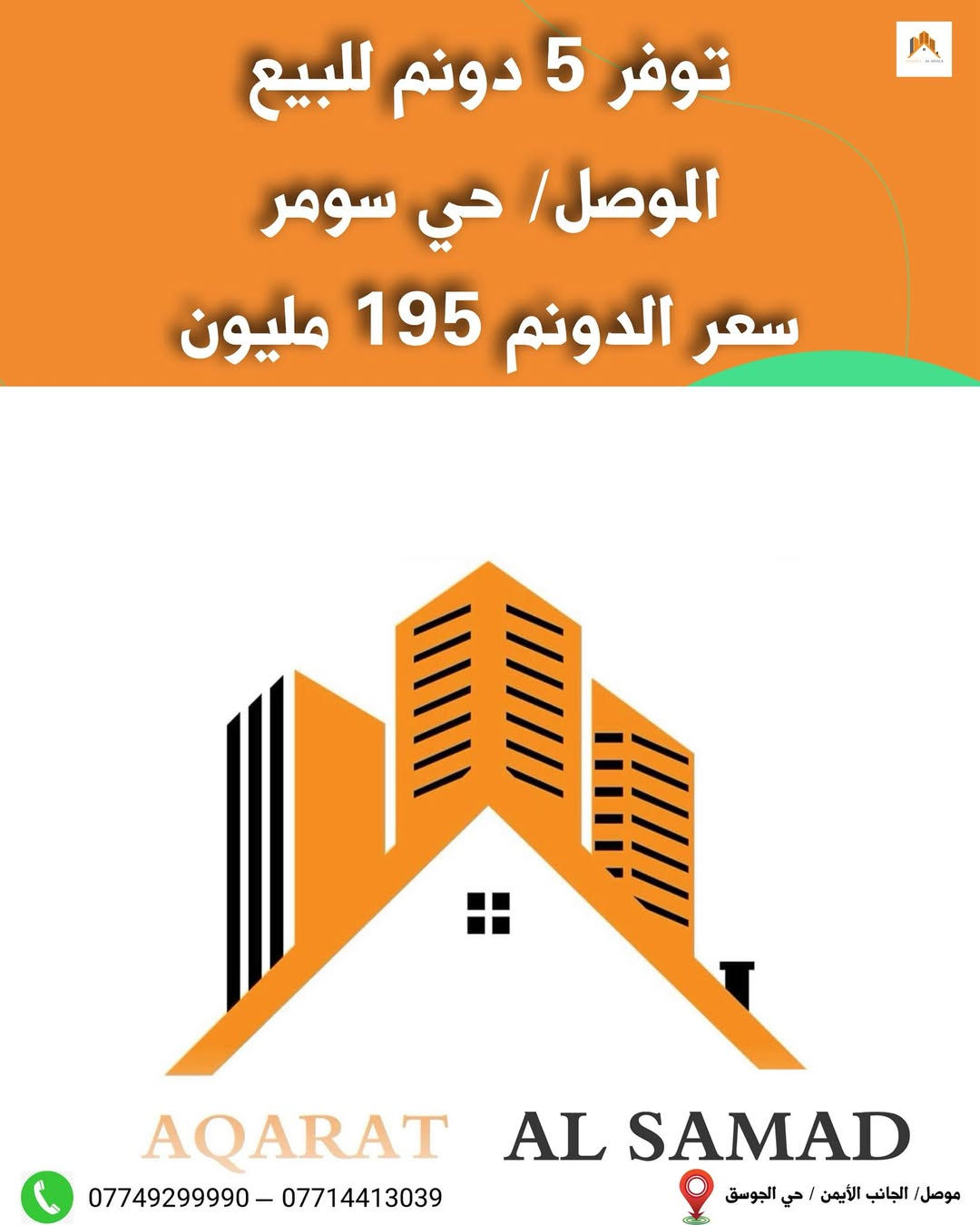 ⭕️ تم توفير⭕️ ((5)) دونم (((للبيع))) ( الموصل-حي سومر) **إذا كنت صاحب هذا الإعلان وتريد حذفه لأي سبب، رجاءا أرسل رسالة إلى الدعم الفني**