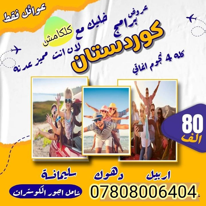 💙>>> اارررربيل << 😍❤️😍 الجمعة 3/20 سوينالكم أربيل 80 الف دهوك 80الف سليمانية. 80 الف سارعوا بالحجز مقاعد محدودة تتضمن رحلة اربيل يوم الى مصايف دهوك + يوم الى مصايف سليمانيه ختياري 💙 باصات حديثه 🚞 💙 كاادر متمرس 🕺 💙 فنادق ممتازه 🏢 💙 وجبات فطور بوفيه مفتوح 🍱 💙 مسابقات وجوائز 🎁 💙 ملاحظه بدون أجور اظافية تشمل النقل والجولات الفطور الفندق 💙 برنامج أربيل 💙 مجدي مول ، مجدي لاند ، قاعة التزلج .كلي علي بيك ، بيخال ، راوندوز ، خليفان ، جوله مسائيه في قضاء شقلاوه ، ، ، يوم مصايف دهوك عقره . سيبه. بجيل. كلي زنطه. + برنامج مسائي داخل اربيل 💙 الاطفال مجاناً الى 5 سنوات من 6 الى 9 نصف بطاقه مقعد 🟡………………………………….. للحجز والاستفسار واتساب *********** *********** عنوان الشركه زيونه شارع الربيعي / مقابيل مول الامير مجمع الدر الطويل للالبسه الرجاليه قرب جامع القزاز