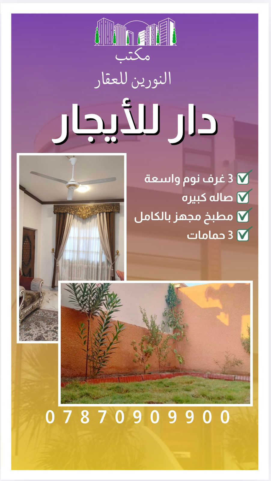 �✨ دار للإيجار – 💯💯 للأيجار 200 متر 💯💯 📍 الموقع: مجمع السلام السكني 🏠 تفاصيل الدار: ▪️ يحتوي على 3 غرف نوم ▪️ الدار نظيف جداً ومسكون قليل ▪️ مناسب لسكن العائلة أو الطلاب ▪️ موقع مميز قريب من جامعة الكفيل 📞 للاستفسار والحجز: *********** #عقارات #ايجار #مجمع_السلام #قريب_جامعة_الكفيل #سكن_طلاب #مكتب_النورين_للعقار
