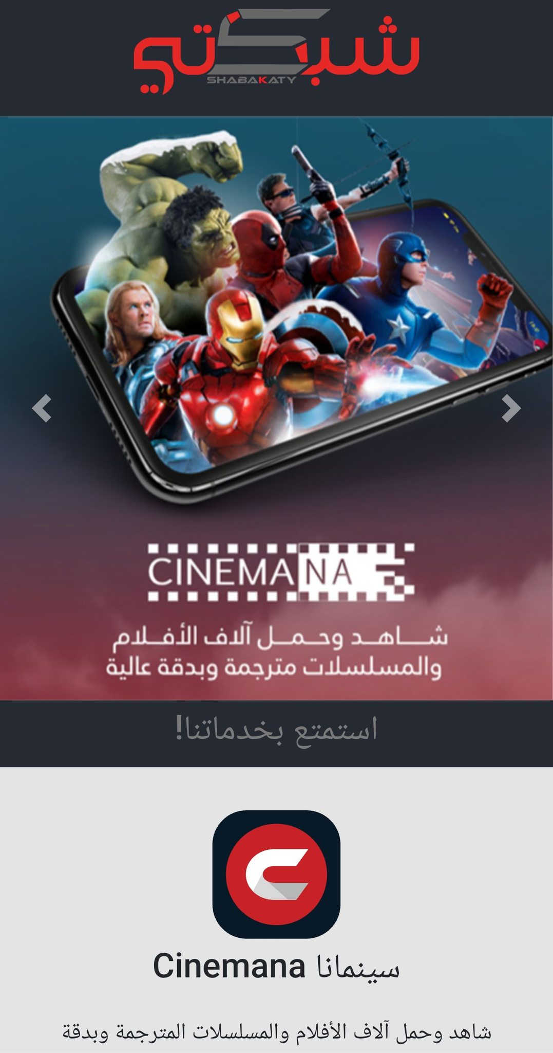تم تحديث الرابط الخاص بسينمانا الى الدومين الجديد https://cinemana.shabakaty.cc للشاشات https://cinemana.shabakaty.cc/CTV/#/home التطبيق الذي يخص اندرويد يجب حذف التطبيق القديم وتنصيب النسخةالجديدة من خلال http://shstore.com/index اما بالنسبة لل cbox تحذف نسخة القديمة من خلال الاعدادات والغاء التثبيت ثم الذهاب الى سينمانا لينباك والتحميل مباشرة التحديث الجديد لكل اندرويد ايفون شاشه @إشارة **إذا كنت صاحب هذا الإعلان وتريد حذفه لأي سبب، رجاءا أرسل رسالة إلى الدعم الفني**
