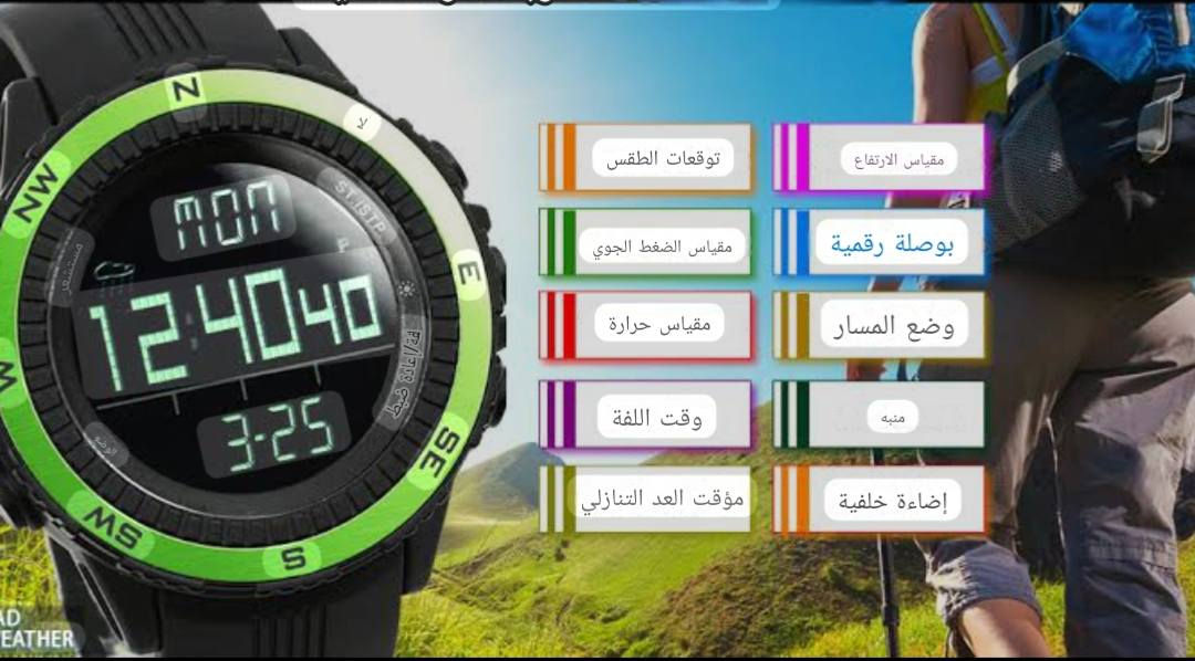 ساعه طراز LAD WEATHER، من سلسلة "Sensor Master" (مثل lad004 أو lad024). الميزات الرئيسية تتضمن هذه الساعة المخصصة للأنشطة الخارجية مجموعة من المستشعرات والميزات المفيدة: مستشعر ألماني عالي الدقة. توقعات الطقس: تتنبأ بالطقس باستخدام أيقونات (مشمس، غائم جزئيًا، غائم، ممطر، عاصف) بناءً على التغيرات في الضغط الجوي. مقياس الارتفاع (Altimeter): يقيس الارتفاع الحالي ويتضمن رسمًا بيانيًا لتاريخ الارتفاع المسجل كل ساعة. مقياس الضغط الجوي (Barometer): يقيس الضغط الجوي ويعرض رسمًا بيانيًا لتاريخ ضغط مستوى سطح البحر. بوصلة رقمية (Digital Compass): توفر قراءات الاتجاهات وإمكانية المعايرة. مقياس الحرارة (Thermometer): يقيس درجة الحرارة المحيطة. ميزات أخرى: تشمل ساعة إيقاف (كرونوغراف)، ومؤقت للعد التنازلي، ومنبه يومي، وإضاءة خلفية. السعر خاص يوجد توصيل **إذا كنت صاحب هذا الإعلان وتريد حذفه لأي سبب، رجاءا أرسل رسالة إلى الدعم الفني**