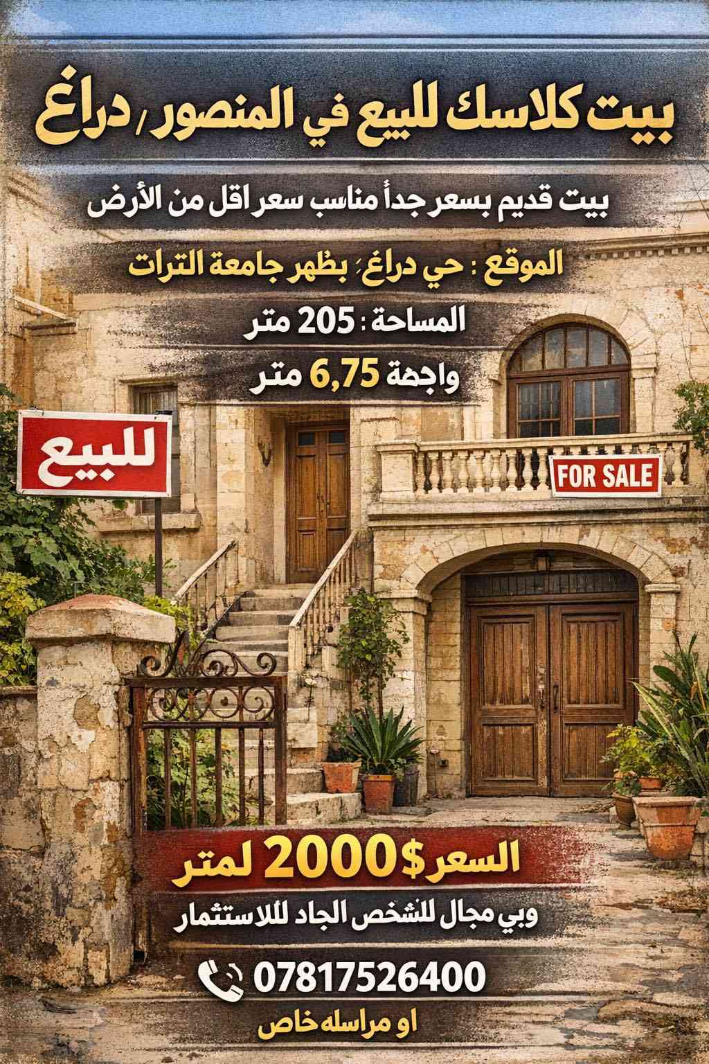 بيت كلاسك للبيع في المنصور / حي دراغ بيت قديم بسعر جداً مناسب سعر اقل من الأرض الموقع حي دراغ بضهر جامعه التراث المساحه 205 متر واجهة البيت 6،75 متر السعر 2000$ للمتر وبي مجال للشخص الجاد للاستثمار اتصال ☎️ *********** او مراسله خاص