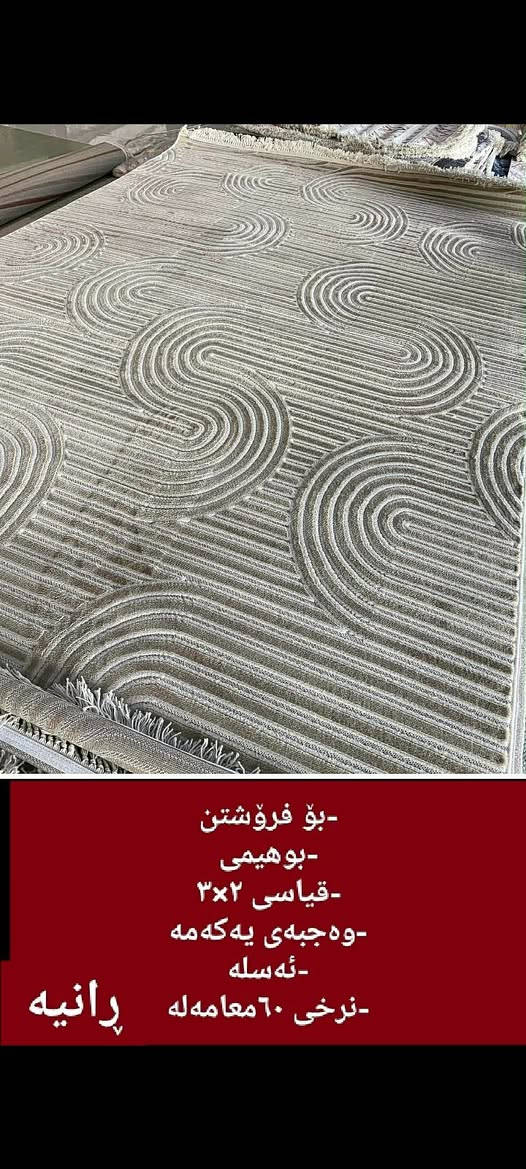 -بـۆ فـرۆشتن -بوهیمی -قـیاسی ٢×٣ -وەجبەی یەکەمە -ئەسلە -لە شـاری ڕانیە -نرخـی ٦٠ومعامەلە رانية, السليمانية **إذا كنت صاحب هذا الإعلان وتريد حذفه لأي سبب، رجاءا أرسل رسالة إلى الدعم الفني**
