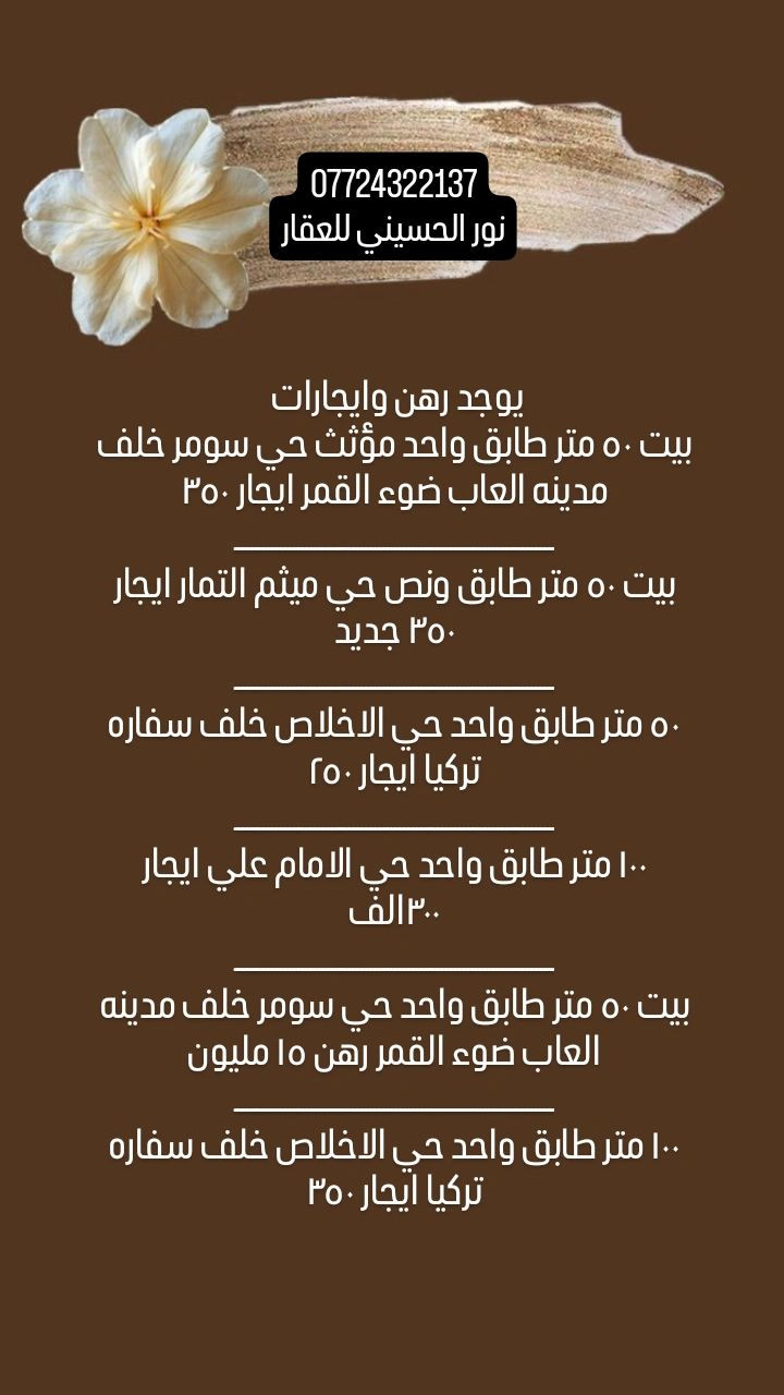 يوجد رهن وايجارات بيت ٥٠ متر طابق واحد مؤثث حي سومر خلف مدينه العاب ضوء القمر ايجار ٣٥٠ ـــــــــــــــــــــــــــــــــــــــــــــــــــــــــــــــــــــــــــ بيت ٥٠ متر طابق ونص حي ميثم التمار ايجار ٣٥٠ جديد ـــــــــــــــــــــــــــــــــــــــــــــــــــــــــــــــــــــــــــ ٥٠ متر طابق واحد حي الاخلاص خلف سفاره تركيا ايجار ٢٥٠ ـــــــــــــــــــــــــــــــــــــــــــــــــــــــــــــــــــــــــــ ١٠٠ متر طابق واحد حي الامام علي ايجار ٣٠٠الف ـــــــــــــــــــــــــــــــــــــــــــــــــــــــــــــــــــــــــــ بيت ٥٠ متر طابق واحد حي سومر خلف مدينه العاب ضوء القمر رهن ١٥ مليون ـــــــــــــــــــــــــــــــــــــــــــــــــــــــــــــــــــــــــــ ١٠٠ متر طابق واحد حي الاخلاص خلف سفاره تركيا ايجار ٣٥٠ ***********
