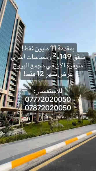 بمقدمة 11 مليون فقط !!! 🔥 توفرت شقق 149م² في مجمع البروج السكني — فرصة ذهبية وعرض خاص لشهر 12 فقط! ✔️ مشروع متكامل بخدمات راقية ✔️ موقع استراتيجي داخل واحدة من أفضل المجمعات ✔️ سعر استثنائي مقارنة بالمشاريع المماثلة ✔️ خيار مثالي للسكن أو الاستثمار طويل الأمد العدد محدود… والعرض ينتهي بانتهاء شهر 12. اغتنم الفرصة قبل نفاد الوحدات! للاستفسار: *********** *********** بغداد