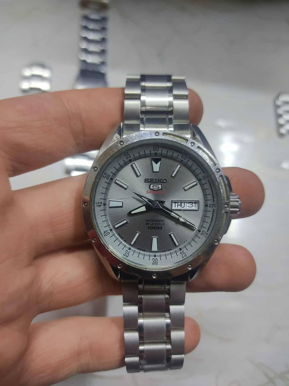 ⌚سايكو ((SEIKO 🇯🇵))⌚ 🇯🇵 أوتوماتك 24 حجر- ياباني أصلي 🇯🇵 ✅ مستعملة ( نظافة 80% ) ✅ 🔴✅ مبدل سير انيق وضابط مع شكل الساعة ( سيرها الاصلي ناقص قطعة مثل ما موضح بالصور ) ✅🔴 ✅ بدون علبة فقط الساعة ✅ 🟠🟠 السعر 120 الف والتوصيل مجاني 🟠🟠 💎 موديل أنيق ومتين جداً 💎 ماكنة أوتوماتك يابانية ⬅️ SEIKO TIME CORP 💎 الكيس من الستينلس ستيل 13mm 💎 ظهر كشف شفاف 💎 بزل ثابت 💎 القطر 41mm ( مع الكوك 45mm ) 💎 👌 💎 عرض لليوم عند الرقم 3️⃣ والتأريخ عند الرقم 3️⃣ 💎 مقاومة للماء 100 متر 💎 زجاج زفير مقاوم للخدش ♦️Case material: Stainless Steel 13mm ♦️Movement: SEIKO TIME CORP ♦️Water resistant: 100 meters ♦️Case diameter: 41mm ♦️Band Material: stainless steel 20mm 🚕🚕 التوصيل مجاناً لبغداد وكافة محافظات العراق 🚕🚕 ☎️ *********** ☎️ 🔰 للحجز والإستفسار مراسلة الصفحة 🔰