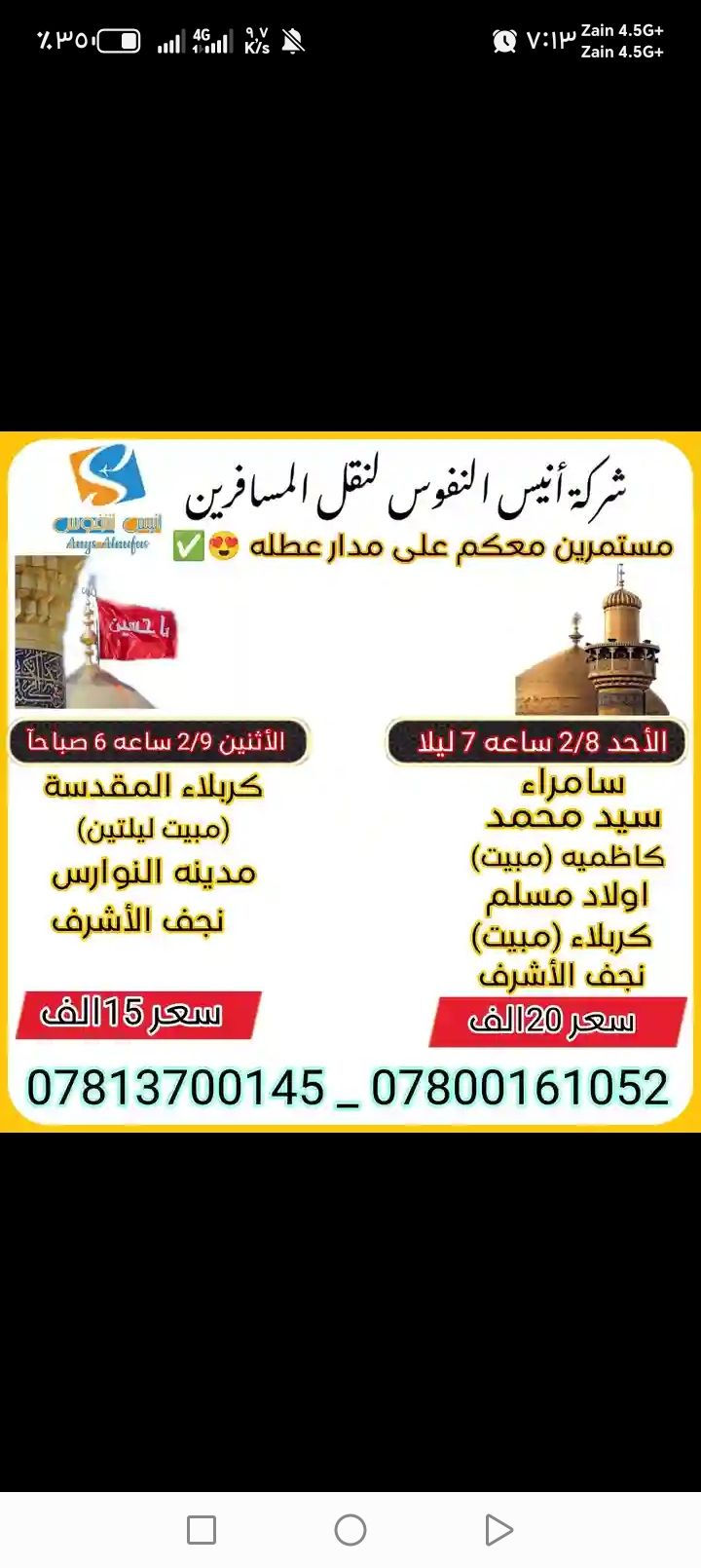 مقاعد محدودة • انطلاق ٢/٥ ٩م • الكاظمية كربلاء نجف