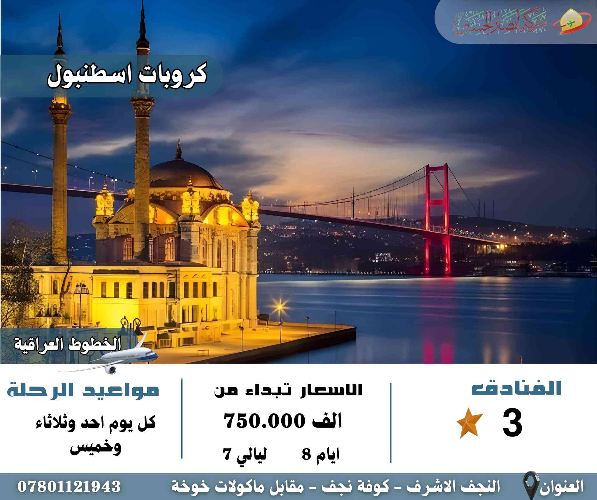 شركة انصار الحسين للسفر والسياحة والحج والعمرة #كروبات_اسطنبول برنامج سياحي مميز يشمل اجمل جولات إسطنبول ومحيطها الأسعار تبدء من 750.000 الف المدة -- 8ايام 7 ليالي السعر يشمل :- جميع التنقلات - تذاكر الطيران - تذكرة تلفريك صبنجا - تذكرة تل فريك بورصة - وجبات الغداء - ملاحضات هامة – السعر من غير الجولات جميع الجولات اختيارية يمكن للمسافر اختيار البرنامج المناسب له حسب الرغبة على ان لا يقل عن 3 جولات - الجولات تشاملجا - عروض الدلافين - صبنجا والطبيعة الخلابة في الجانب الاسيوي تشمل النقل الغداء وتلفريك - السهرة الشامية تشمل النقل البري والبحري والعشاء - فلوريا واكواريوم الأسماك شامل النقل فقط - جزر الاميرات تشمل النقل البري والبحري والعشاء - بورصة الخضراء تشمل النقل الغداء وتذاكر التل فريك الكبير للتواصل والاستفسار الاتصال - *********** – *********** – *********** - *********** #انصار_الحسين_للسفر_و_السياحة #شركة_انصار_الحسين #سفر_كروبات_اسطنبول #سافر_الان