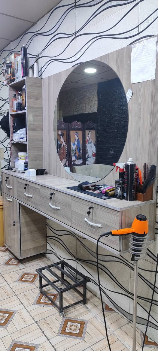 صالون حلاقة • تصميم عصري • أدراج وإضاءة مدمجة