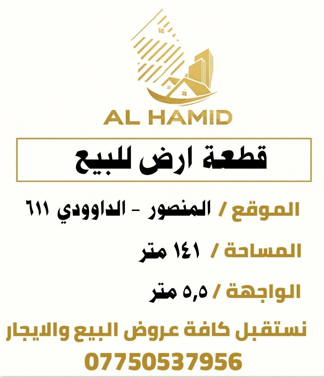 قطعة ارض للبيع في المنصور الداودي محلة 611 المساحة 141 متر ،،،، والواجهة 5 ونص متر للأستفسار اكثر { *********** } نستقبل كافة عروض البيع والايجار ، - عقارك بأييد أمينة مع مجموعة الحامد العقارية لرؤية المزيد من العروض يرجى الدخول الى الصفحة #بغداد #المنصور