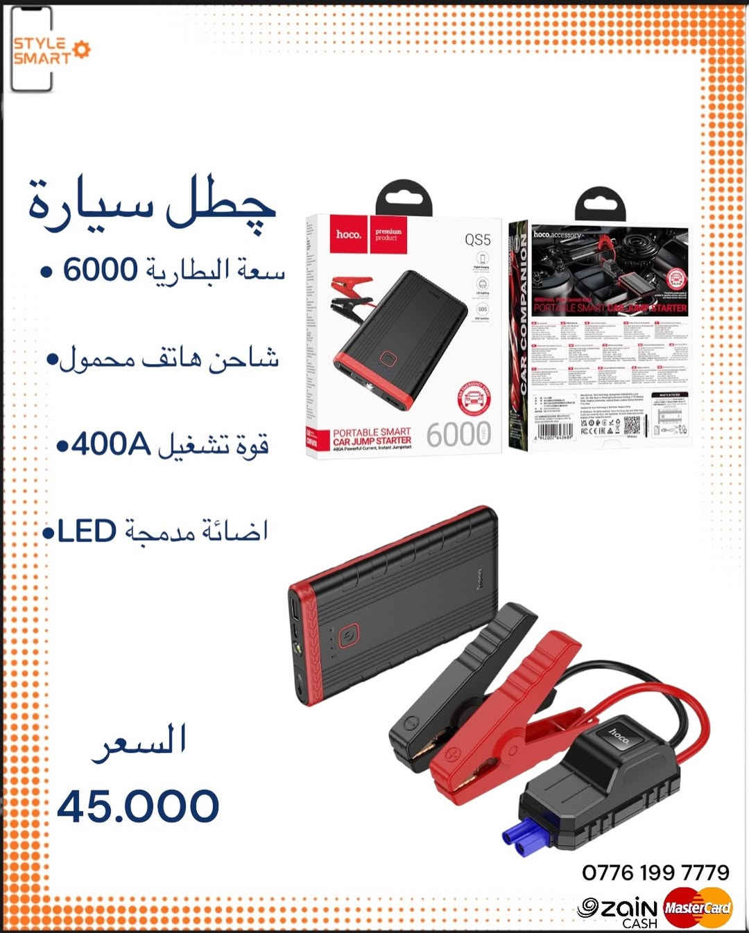چطل سيارة هوكو QS5 ————————- المميزات ✅ ✔️ سعة البطارية6000mhA ✔️تشغيل فوري للسيارة ✔️باور بانك متعدد الاستخدام ✔️اضائةLED مدمجة ✔️ حجم صغير ووزن خفيف ✔️ مشابك قويه وامنه ✔️ مناسب للطوارئ والسفر ————————- الضمان: 12 شهر كاملة لضمان راحتك ورضاك ————————- السعر 45 الف ————————- هدية مع كل طلب توصيل 5 الالف لكل العراق ————————- للحجز عبر الواتساب *********** #style_smart2025