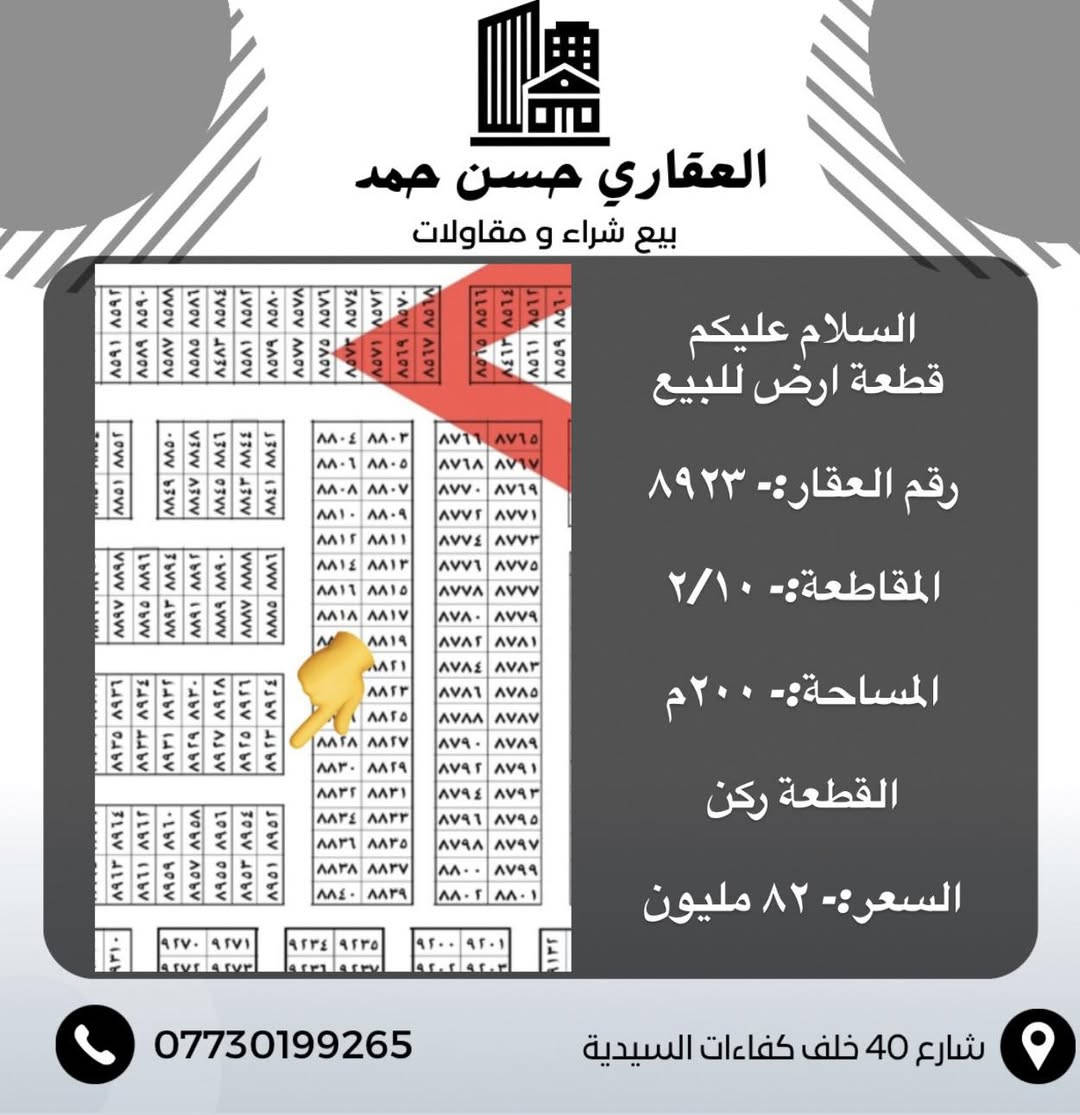 السلام عليكم قطعة ارض للبيع رقم العقار:- ٨٩٢٣ المقاطعة:- ٢/١٠ المساحة:- ٢٠٠م القطعة ركن السعر:- ٨٢ مليون للاستفسار الاتصال على الرقم (***********)☎️ بغداد_شارع 40 خلف كفاءات السيدية📍
