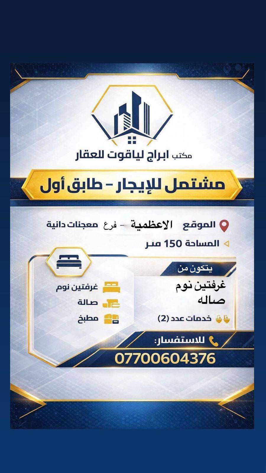 � مشتمل للإيجار – طابق أول 🔹 📍 الموقع: الأعظمية – فرع معجنات دانية خلف رحبي 📐 المساحة: 150 متر 🏠 يتكون من: • غرفتين نوم • صالة • مطبخ • خدمات عدد (2) 📞 للاستفسار: ***********