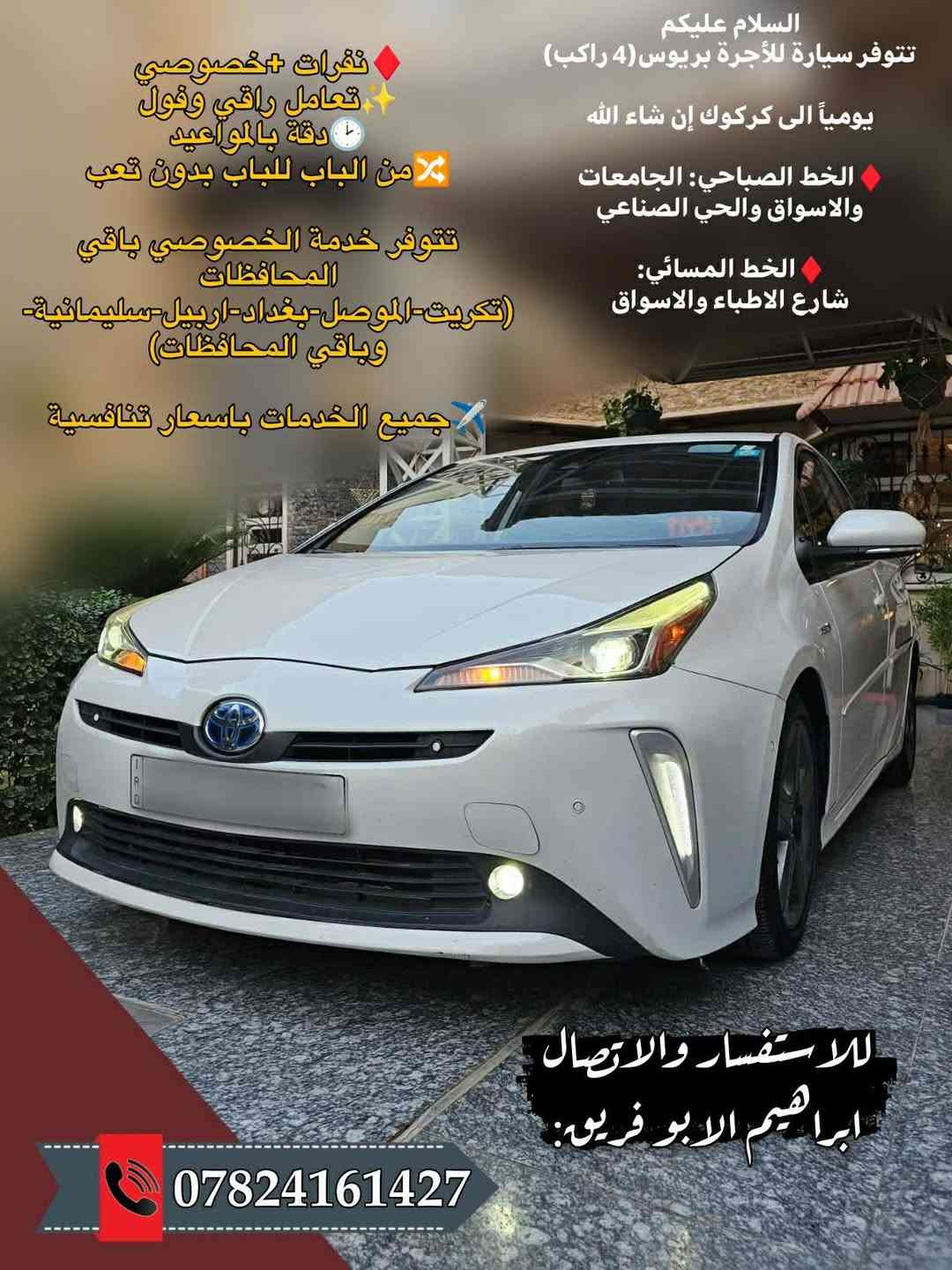 السلام عليكم تتوفر سيارة للأجرة بريوس(4 راكب) الخط الصباحي: الجامعات والاسواق والحي الصناعي الخط المسائي: شارع الاطباء والاسواق ♦نفرات +خصوصي ✨تعامل راقي وفول 🕑دقة بالمواعيد 🔀من الباب للباب بدون تعب تتوفر خدمة الخصوصي باقي المحافظات ( تكريت - موصل - بغداد - اربيل - سليمانيه وباقي المحافظات ) ✈️جميع الخدمات باسعار تنافسية للاستفسار والاتصال: ابراهيم الابو فريق: ***********