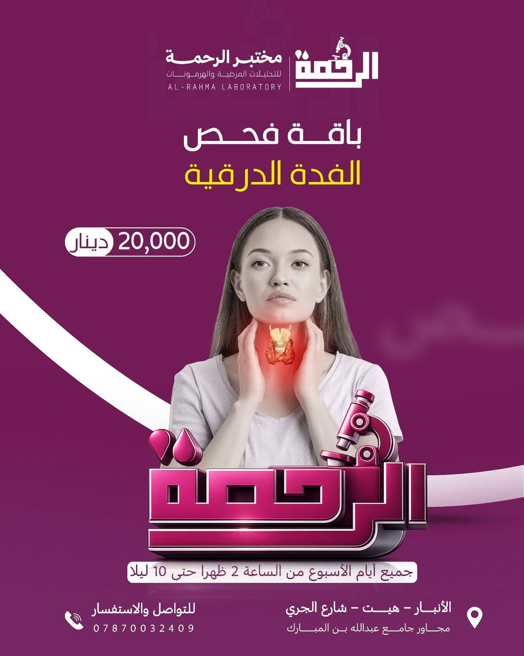 🔥 عرض خاص ومميز من مختبر الرحمة للتحليلات المرضية والهرمونات 🔥 🩺 باقة فحص هرمونات الغدة الدرقية الثلاثية للاطمئنان على صحة الغدة الدرقية وكشف أي اضطراب قد يسبب التعب، تساقط الشعر، زيادة أو نقص الوزن، أو الخمول. ✅ تشمل الباقة: ✔️ TSH ✔️ T3 ✔️ T4 💥 نتائج دقيقة وبأجهزة حديثة وتحت إشراف كادر مختص 📍 العنوان: هيت – شارع الجري – مجاور جامع عبدالله بن المبارك 🕑 أوقات الدوام: جميع أيام الأسبوع من الساعة 2 ظهراً حتى 10 ليلاً 🚗 خدمة السحب المنزلي المجاني متوفرة لراحتكم دون عناء المجيء إلى المختبر. 📞 بادر بالحجز الآن واطمئن على صحتك… لأن صحتك تستحق الأفضل!