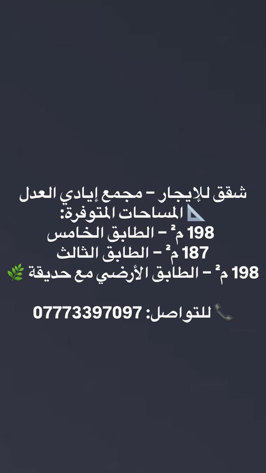 شقق للإيجار – مجمع إيادي العدل 📐 المساحات المتوفرة: • 198 م² – الطابق الخامس • 187 م² – الطابق الثالث • 198 م² – الطابق الأرضي مع حديقة 🌿 📞 للتواصل: ***********