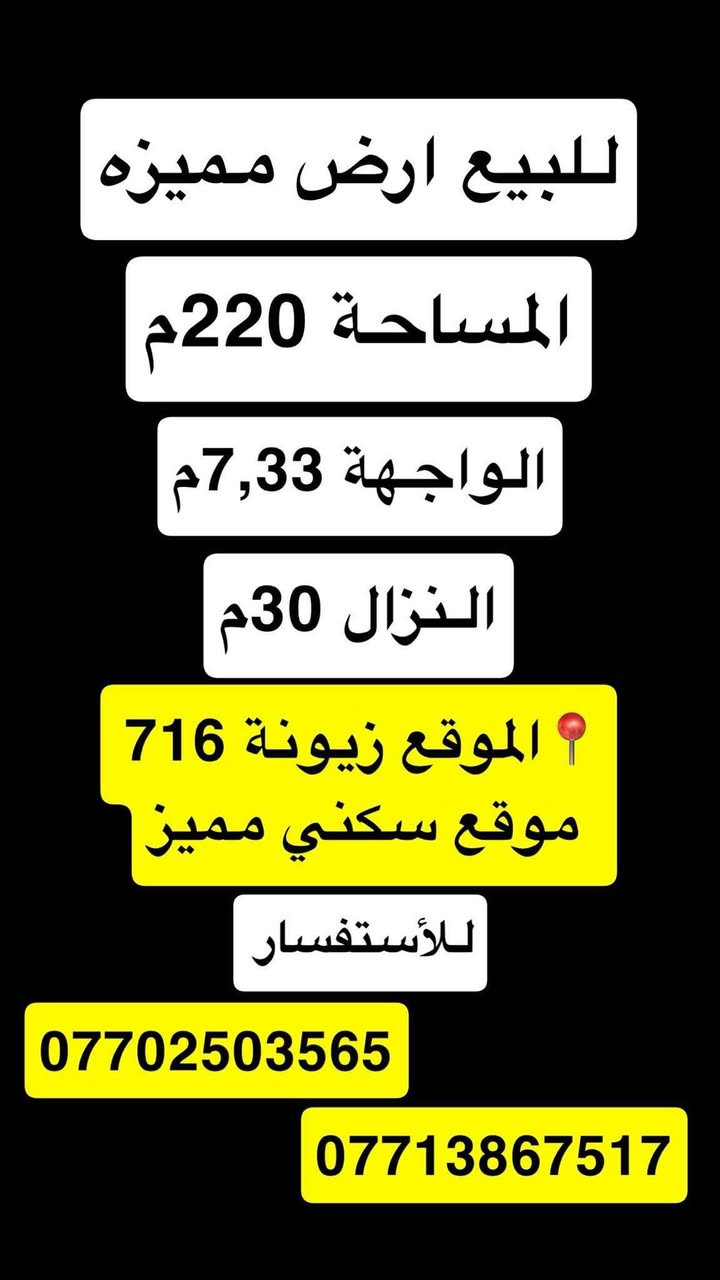 للبيع قطعة ارض مميزه 📍 الموقع زيونة 716 مربع سكني هادئ ✅ المساحة——–220م ✅ الواجهة—— 7,33 م ✅ النزال——30م ________________________ #أعرض_عقارك_وأنت_مطمأن_في_مكتب_مجاز_رسمياً للأستفسار ⬇️ #مكتب_الشمري_للخدمات_العقارية 📱*********** ابو حسين الشمري 📱*********** حسين الشمري 🏡 عنوان المكتب(زيونة 716-مدخل الجدار سنتر القديم او (حلى بغداد) مقابل مدرسة الزوراء) #للاعلان_عن_عقاراتكم_من_بيع_شراء_ايجار فقط ارسل التفاصيل والصور خاص او واتساب ع الارقام اعلاه #بيع_شراء_ايجار_مشاريع_استثمارات📍 #استثماربناء_تعقيب_ترميم_تثمين_دورسكنيه_عمارات_محال_تجاريه_استثمار_اراضي_بغداد_زيونه_الغدير بغداد, العراق