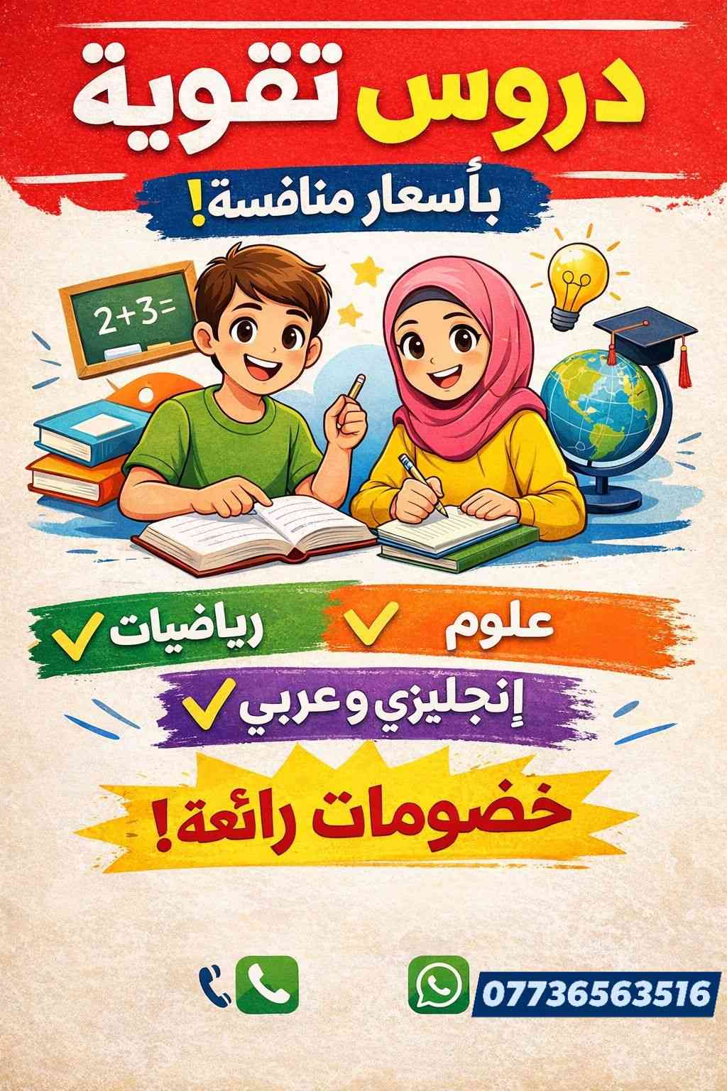 هل تبحث عن مستوى أفضل لابنك او بنتك؟ نقدم دروس تقوية لجميع المراحل ✔ شرح مبسّط وسهل ✔ متابعة مستمرة مع الطالب ✔ تأسيس قوي وحل واجبات ✔ أسعار تنافسية تناسب الجميع ⚠️اول محاضره مجانيه 📖 المواد: رياضيات – علوم – عربي – إنجليزي ✅️نتعامل بنظام المفرد والحقيبه ايضا 🎯 لا تضيع الفرصة… العدد محدود! 📩 للتواصل راسلنا الآن *********** ***********