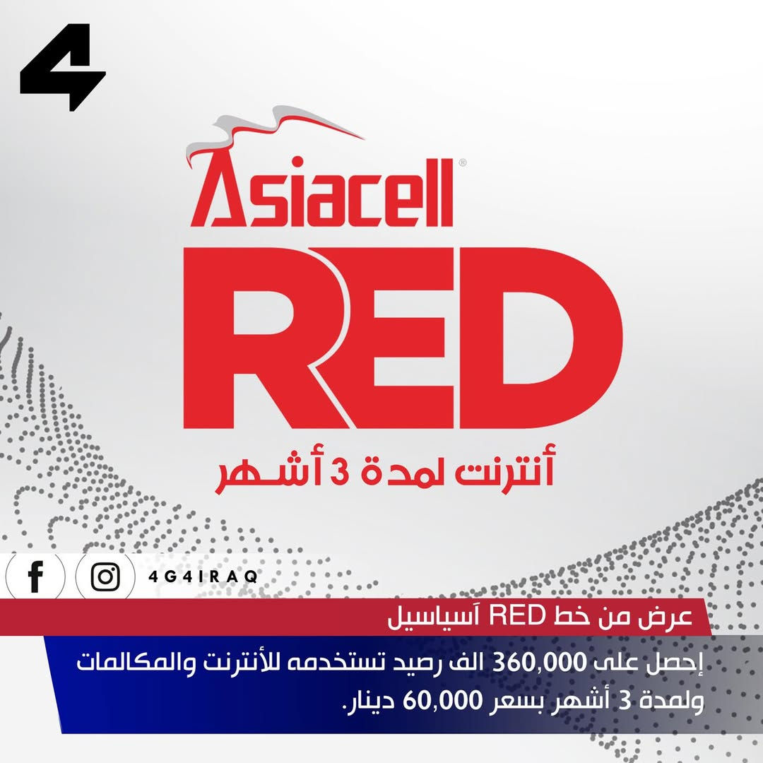 عرض من خط RED آسياسيل إحصل على 360,000 الف رصيد تستخدمه للأنترنت والمكالمات ولمدة 3 أشهر بسعر 60,000 دينار **إذا كنت صاحب هذا الإعلان وتريد حذفه لأي سبب، رجاءا أرسل رسالة إلى الدعم الفني**