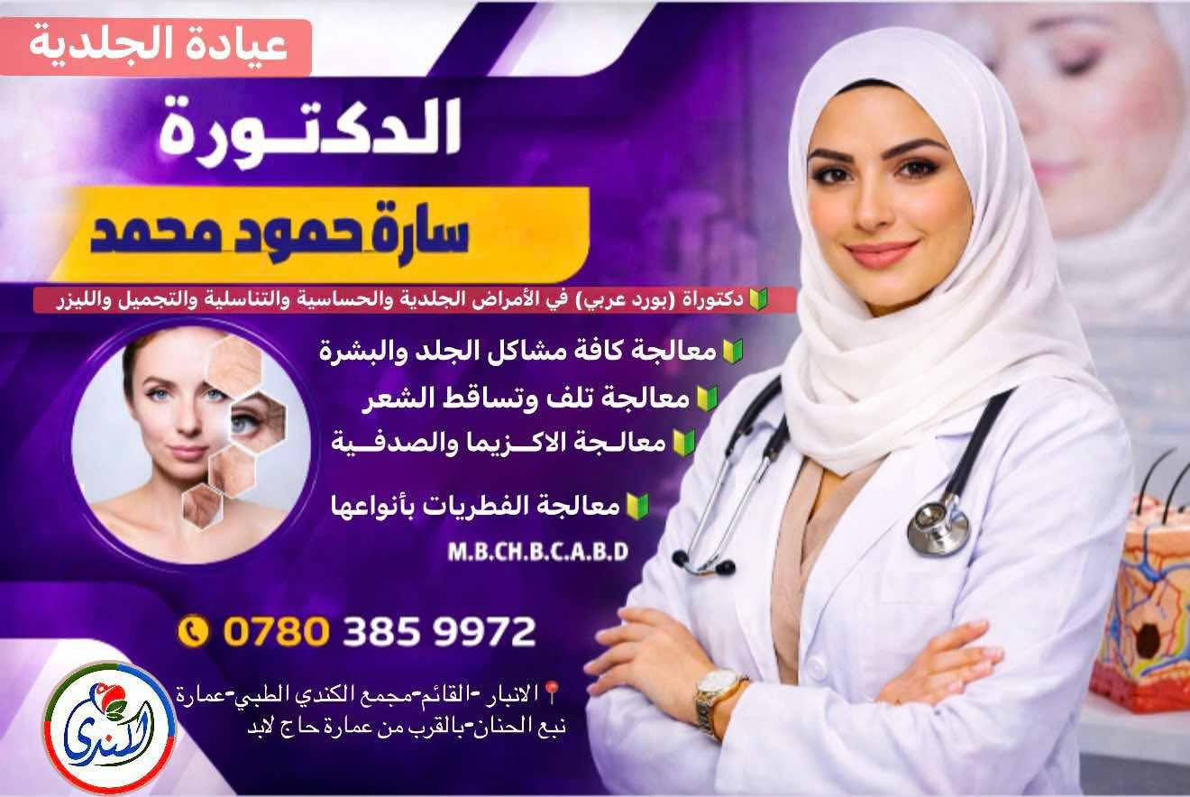 الدكتوره 🔸ساره حمود 🔸 اختصاص جلدية وتجميل تمتاز الدكتورة بمعالجة 🔰كافة مشاكل الجلد والبشرة 🔰تلف وتساقط الشعر والصلع 🔰الاكزيما والصدفية والفطريات 🔰مشاكل فروة الرأس 🔰معالجة التصبغات والكلف 🔰معالجة حب الشباب تتواجد في مجمع الكندي الطبي ولكافة ايام الشهر عدا الجمعة والسبت من الساعه ال٣:٣٠ عصراً لل ٨:٣٠ مساءً 📍الانبار-القائم-مجمع الكندي الطبي -عمارة نبع الحنان - بالقرب من اسواق الحاج لابد للحجز والاستفسار: ***********