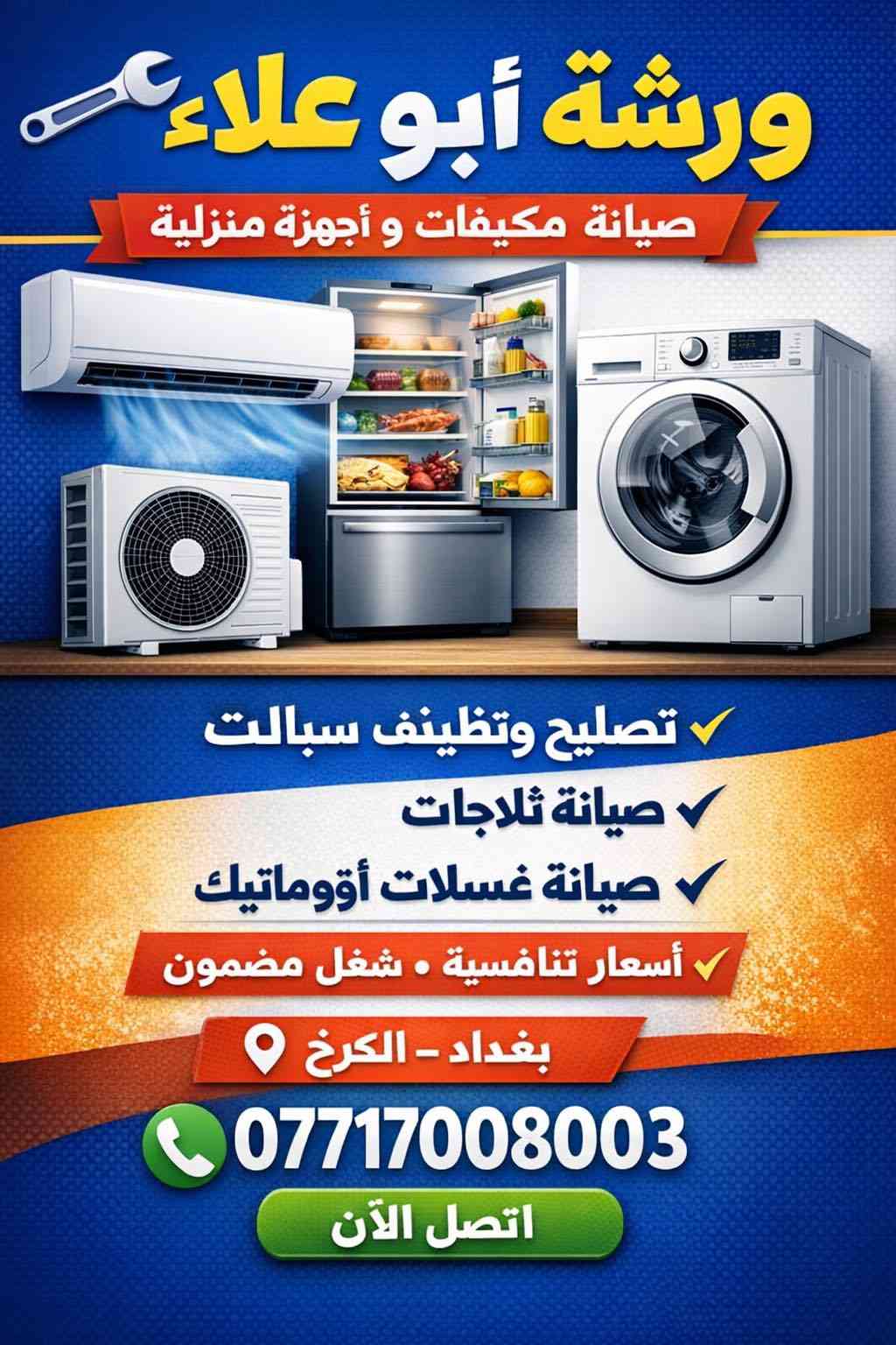 � ورشة أبو علاء 🔧 لتصليح وصيانة أجهزة التبريد والتكييف ولغسالات ✅ صيانة وتنظيف مكيفات سبالت ✅ تركيب وفك المكيفات ✅ شحن فريون ✅ صيانة الثلاجات ✅ صيانة الغسالات الأوتوماتيك 📍 بغداد – الكرخ 💰 أسعار تنافسية 🛠️ خبرة + شغل مضمون ⏱️ سرعة بالإنجاز 📞 رقم الهاتف: *********** 📲 اتصل أو راسل واتساب ورشة أبو علاء بخدمتكم دائمًا #غسالة #صيانة #غسالة