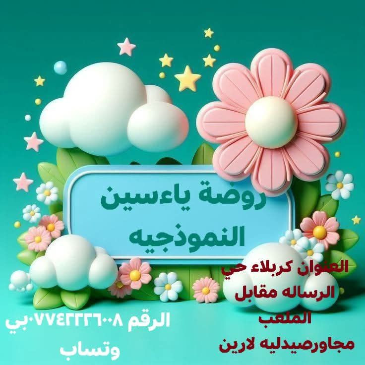 اعلان 💐 اعلان 💐 تعلن روضه وحضانه ياء سين النموذجيه عن تخفيض القسط الشهري ٦٠الف مع الخط و الأحياء المشملوله بلعرض (الوفاء ،الميلاد،الالسكان العسكري ،الحشد،الف دار،الاطارات ،الشهداءسيف، سيف سعد،التعاون ،الإسكان قرب مستشفى الحسيني الجاهز، النصر،الفارس ) العرض لفتره محدوده نستقبل جميع لاعمار يتوفرنضام الساعات💐 يتوفرنضام الشفتات 💐 اطفالكم بامان مع روضة ياءسين العنوان كربلاء حي الرساله مقابل الملعب الرقم ***********بي وتساب #
