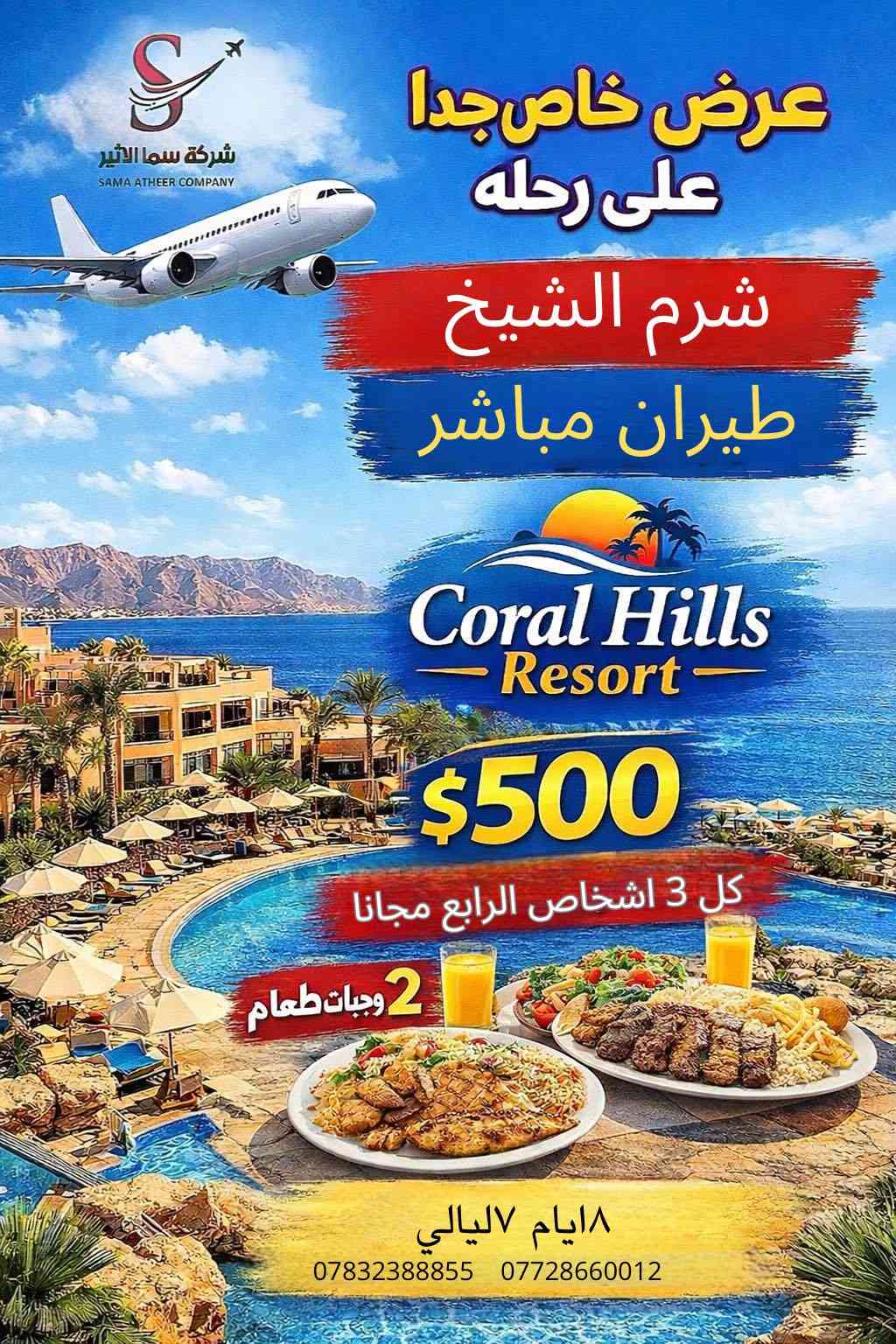 عروض مميزة إلى شرم الشيخ ✈️ <<<<<*كل 3 الرابع مجانا* >>>>>>>> استمتعوا بأجمل الأوقات في مدينة السحر والجمال شرم الشيخ شواطئ فيروزية ✨ منتجعات فاخرة 🏨 أنشطة بحرية ورحلات سفاري لا تُنسى 🐠🏜️ 🔹 برامج سياحية متنوعة 🔹 فنادق 3 و4 و5 نجوم 🔹 أسعار متدرجة حسب الفندق او المنتجعات 🔹 إمكانية إضافة جولات وأنشطة حسب الطلب *احجز رحلتك الآن وخلي إجازتك مختلفة*💙 شركة سما الأثير للسفر والسياحة 📞 *********** 📞 *********** السيديه الشارع التجاري عماره علاء حداد مجاور مطعم سن ستي لكل عشّاق السفر ومحبي الاكتشاف 🌍✈️ نقدّم لكم قناة عروض الطيران والسفر، حيث تجدون أحدث عروض أسعار التذاكر، والكروبات السياحية الداخلية والخارجية، بالإضافة إلى الفيز المسموحة للجواز العراقي وفيز الشنغن والحج والعمرة. انضموا إلينا لتبقوا على اطلاع دائم بكل جديد في عالم السياحة والسفر: 🔗 https://chat.whatsapp.com/BiUUGxPSen85iT6lDMvaDY?mode=wwt