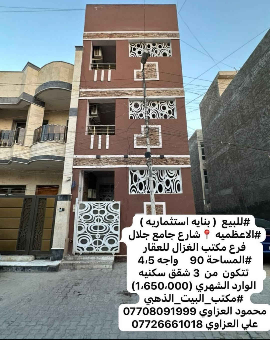 #للبيع ( بنايه استثماريه ) #الاعظميه 📍شارع جامع جلال فرع مكتب الغزال للعقار #المساحة 90 م واجه 4،5 م #تتكون من 3 شقق سكنيه كل شقه #تحتوي 2 غرف نوم +مناور عدد 2 ومطبخ معزول عن الصاله . وخدمات . #كل شقه تحتوي على خزان ماء سعه 1000 لتر . وماطور ماء مستقل + سخان .. #كهرباء كل شقه معزوله عن الشقه الاخرى .. الوارد الشهري (1،650،000) #مكتب_البيت_الذهبي محمود العزاوي *********** علي العزاوي ***********