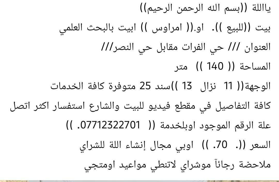 يااللة اسلام عليكم بيت للبيع حي الفرات مقابل حي النصر سند 25 باقي التفاصيل في الصور ومقطع فيديو مفصل استفسار اكثر اتصل على رقم *********** السعر 70 اوبي مجال إنشاء الله
