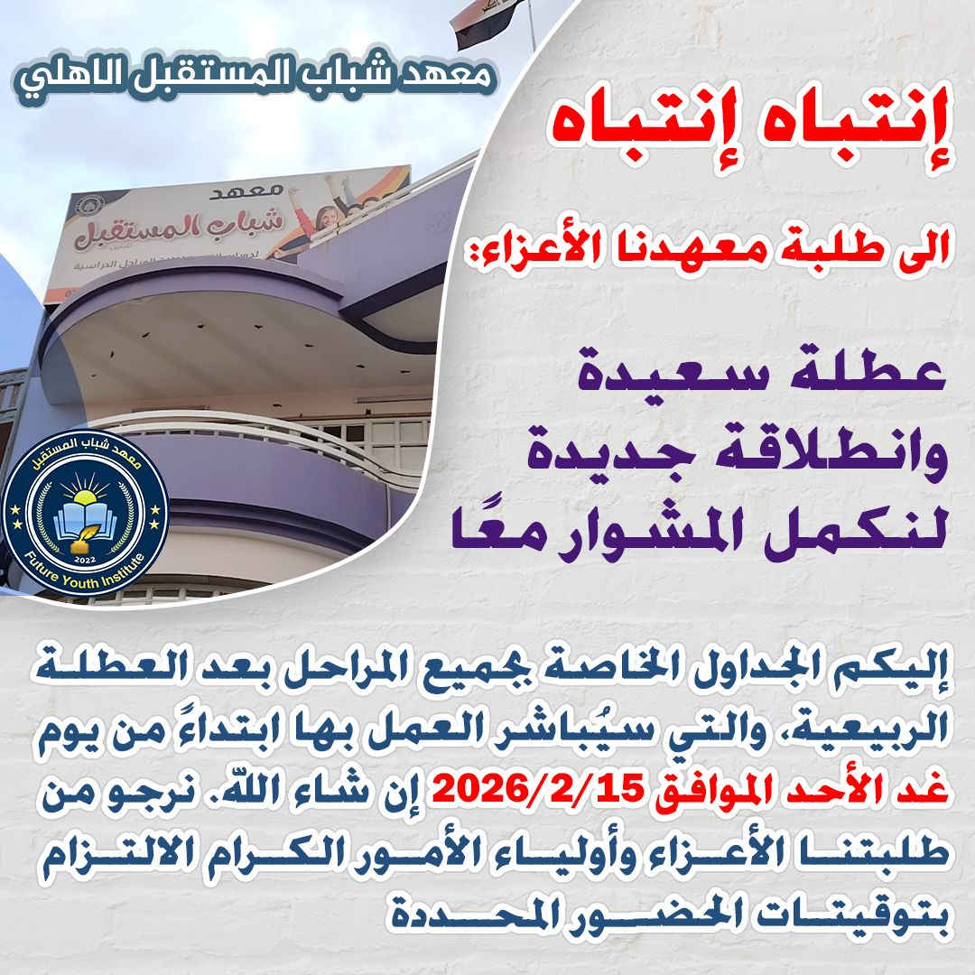 🚨 انتباه… انتباه 🚨 إلى طلبة معهد شباب المستقبل الأهلي الأعزاء: 🌸 عطلة سعيدة، وانطلاقة جديدة نكمل بها المشوار معًا. 📅 نرفق إليكم الجداول الدراسية بعد العطلة الربيعية للمراحل المنتهية في معهدنا. ⏰ سيتم المباشرة بالدوام ابتداءً من يوم غدٍ الأحد الموافق 2026/2/15 إن شاء الله. ⚠️ نؤكد على جميع طلبتنا الأعزاء وأولياء الأمور الكرام ضرورة الالتزام بتوقيتات الحضور المحددة في الجداول. ✨ نتمنى لكم دوامًا موفقًا ومثمرًا. 📚 معهد شباب المستقبل الأهلي شباب اليوم، قادة المستقبل 🌟 📍 الموقع: الموصل / حي المزارع، مقابل منتزه بيست فيو 📞 للتواصل والاستفسار: *********** – *********** --------------------- #معهد_شباب_المستقبل_الأهلي #الموصل #دورات_شتوية #معاهد_الموصل #تعليم