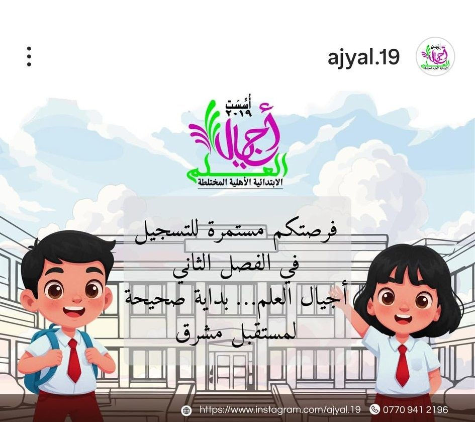 السلام عليكم ورحمة الله وبركاته تعلن مدرسة أجيال العلم الابتدائية الأهلية المختلطة عن فتح أبوابها مجدداً لاستقبال طلبة النقل من المدارس الأخرى نسعد بانضمام أبنائنا الطلبة إلينا ضمن بيئة تعليمية متميزة تهتم بالعلم والتربية وصناعة جيل واعٍ ومبدع أهلاً وسهلاً بالجميع ونسأل الله التوفيق والنجاح لأبنائنا الطلبة
