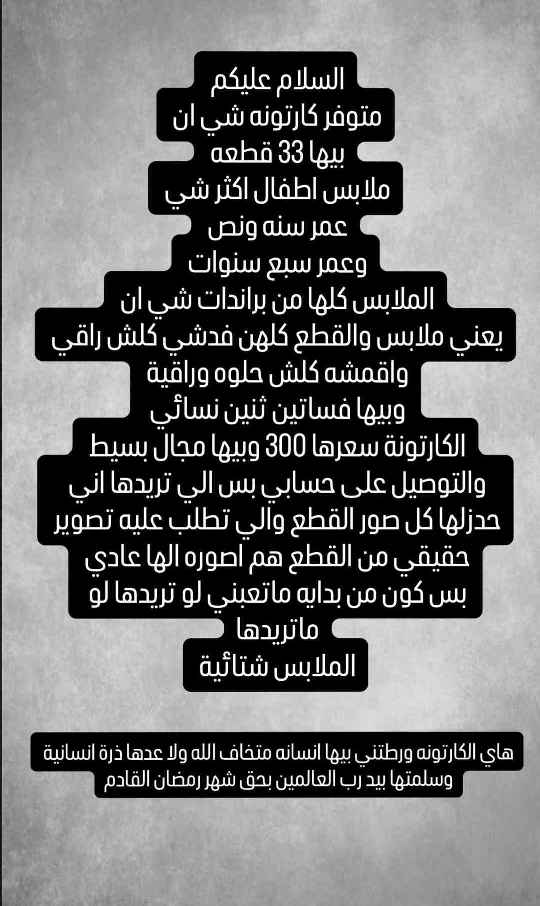 السلام عليكم بنات بنات فدوه حبابين اني متضررة ضرر كلش جبير والطلبيه كلش غاليه عليه الي يعجبها ويفيدها السعر خلي تدخلي خاص وادزلها الصور وتدلل والسعر بي مجال والقطع والله والله وهذا الله شاهد عليه يوكفن العقل وحلوات بشكل مو طبيعي والي تراسلني راح تشوف جمال القطع هي وحدة متخاف الله ورطتني واني وسيطة شحن والكارتونه خصمت من سعرها تقريبا ثلث السعر **إذا كنت صاحب هذا الإعلان وتريد حذفه لأي سبب، رجاءا أرسل رسالة إلى الدعم الفني**