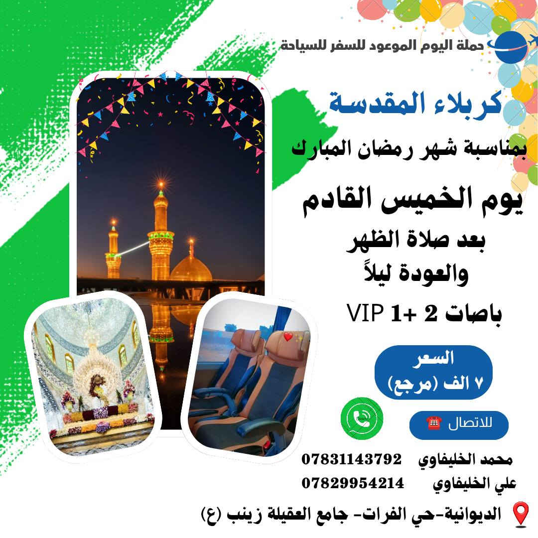 #شهر_رمضان_المبارك_باصات_Vlp 🌙 ⭐ 🌃🌙#برنامج_شهر_رمضان_المبارك 🌃🌙 تعـــلن قافلة اليــوم المــوعود للســـفر والسيــاحة ولزيــارة العتـــبات المقـــدسة اهــالي الديــــوانــية 🕌 يوم الخميس القادم 2026/2/19 ⚠️ ✨ 🚌 الـبـاص الاول 🚌✨ ⚠️ الانـطـلاق/ الـسـاعـة 1 ظـهـراً 🕕 والـعـوده /الـسـاعة 11 ليلاً🕕 كل هذا بســعر 7️⃣ الـف ديــنار فــقـط (مرجــع) ⚠️ ✨ 🚌 الـبـاص الـثـانـي 🚌 ✨⚠️ الانــطــلاق بـعـد الـفـطـور الـسـاعـة 7 لـيـلاً 🕕 والـعـودة بـعـد صـلاة الـصـبح مـبـاشـرة🕕 كل هذا بســعر 7️⃣ الـف ديــنار فــقـط (مرجــع) ⚠️ مـلاحـظـة /الـبـاصـات VIP 2+1🚌💺⚠️ 🔴🟠🟡🟢🔵🟣🔴🟠🟡🟢🔵🟣 التــجـــمع /الديـــوانــية ⬅️حـــي الفـــرات🌍 جامع العقيلة زينب ⬅️قرب سنتر علي للتسوق 🌍 للحــجــز الاتصــال علــى الرقم التـــالــي ☎️ *********** ☎️ مــحــمدالخلــيفـاوي *********** ☎️ كروب التليجرام https://t.me/mhrh43 مـــوقـــع الـــتجــمع https://maps.app.goo.gl/QELUD3opeAyXcRQj6