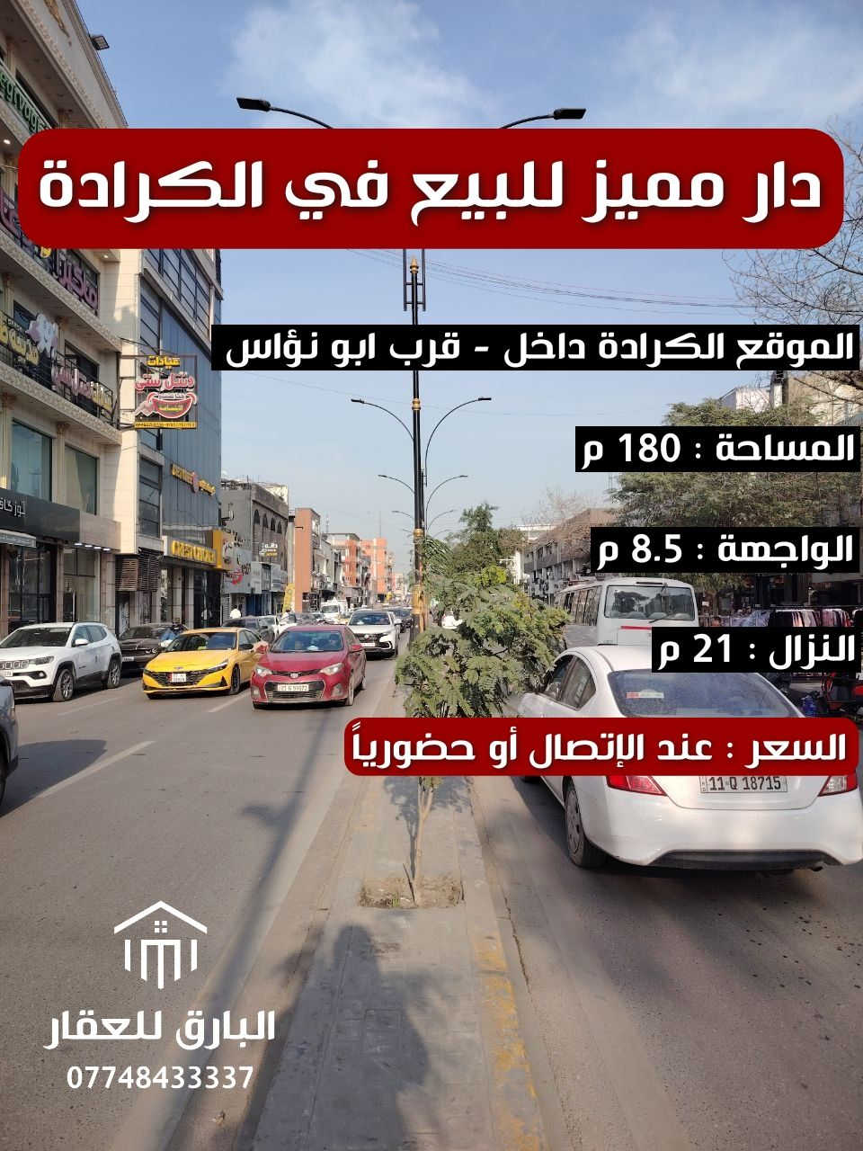 🔱 دار مميز للبيع في منطقة الكرادة 🔱 الموقع📍 : الكرادة داخل - قرب ابو نؤاس ⭕ المساحة : 180 م ⭕ الواجهة : 8.5 م ⭕ النزال : 21 م ⭕ المشيدات : 3 طابق 🏡 التقسيم الداخلي : 🔺 الطابق الأرضي : مدخلين - مطبخ - استقبال - هول داخلي - غرفة - 2 حمام - كراج - حديقة 🔺 الطابق الأول : 3 غرف نوم - 2 حمام 🔺الطابق الثاني : غرفة نوم - سطح واسع ⭕ السعر البيع : عند الإتصال او حضورياً 📞 ⭕ للإستفسار : ( الواتساب متاح ) 📱 *********** ⚠️” تحذير : هذا العرض قد يختفي قبل أن تقرر !“ 🟢 نستقبل عروض البيع ، الشراء ، الإستبدال ، إدارة الأملاك ، و الإيجارات بأنواعها ( سكني ، تجاري ، خدمي ) 🟢 عنوان المكتب📍: بغداد - الكرادة داخل - قرب مطعم الصبايا - فرع مدرسة لبنان ( موقعنا مثبّت على Waze , Google maps ) #البارق_للعقار بغداد, العراق