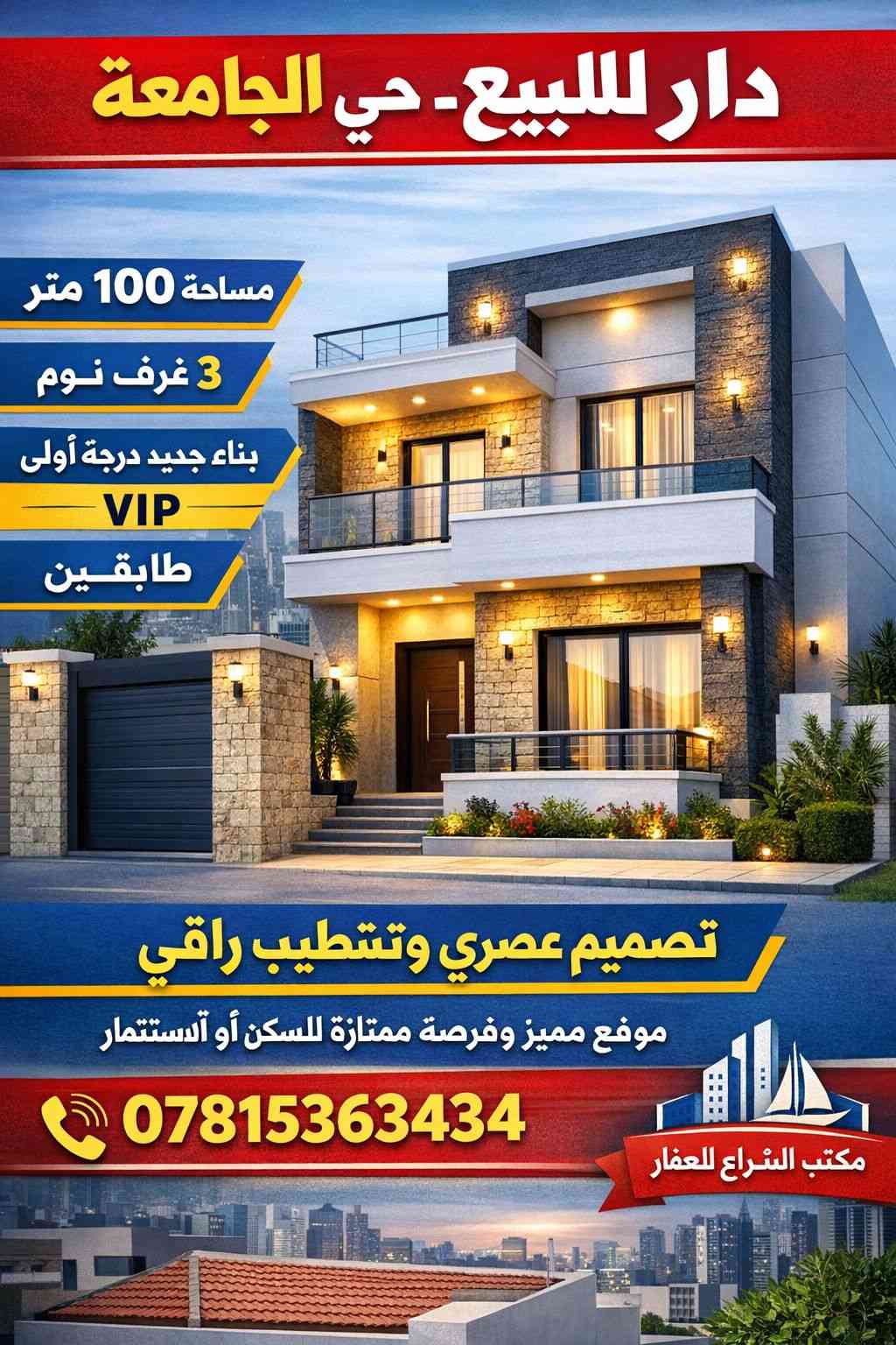🏡 دار للبيع – حي الجامعة 🔹 المساحة: ١٠٠ متر 🔹 البناء: جديد درجة أولى (VIP) 🔹 بإشراف هندسي 🔹 عدد الغرف: ٣ غرف نوم 🔹 عدد الطوابق: طابقين 🔹 تصميم عصري وتشطيب راقي ✨ موقع مميز وفرصة ممتازة للسكن أو الاستثمار 📞 للاستفسار الاتصال: *********** 🏢 أو مراجعة مكتب الشراع للعقار