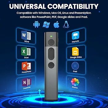 جهاز تحكم عن بعد للعروض التقديمية اللاسلكي (Wireless Presentation Clicker) الذي يعمل بتردد 2.4 جيجاهرتز. المواصفات: بطارية مدمجة قابلة لإعادة الشحن بقدرة 200 مللي أمبير، توفر أسبوعاً من الاستخدام بعد شحنها يحتوي على مؤشر ضوء أخضر ساطع يسهل رؤيته على الشاشات متوافق مع أنظمة التشغيل Windows، Mac OS، و Linux، بالإضافة إلى برامج مثل PowerPoint، PDF، Google Slides، و Prezi السعر 10 الف **إذا كنت صاحب هذا الإعلان وتريد حذفه لأي سبب، رجاءا أرسل رسالة إلى الدعم الفني**