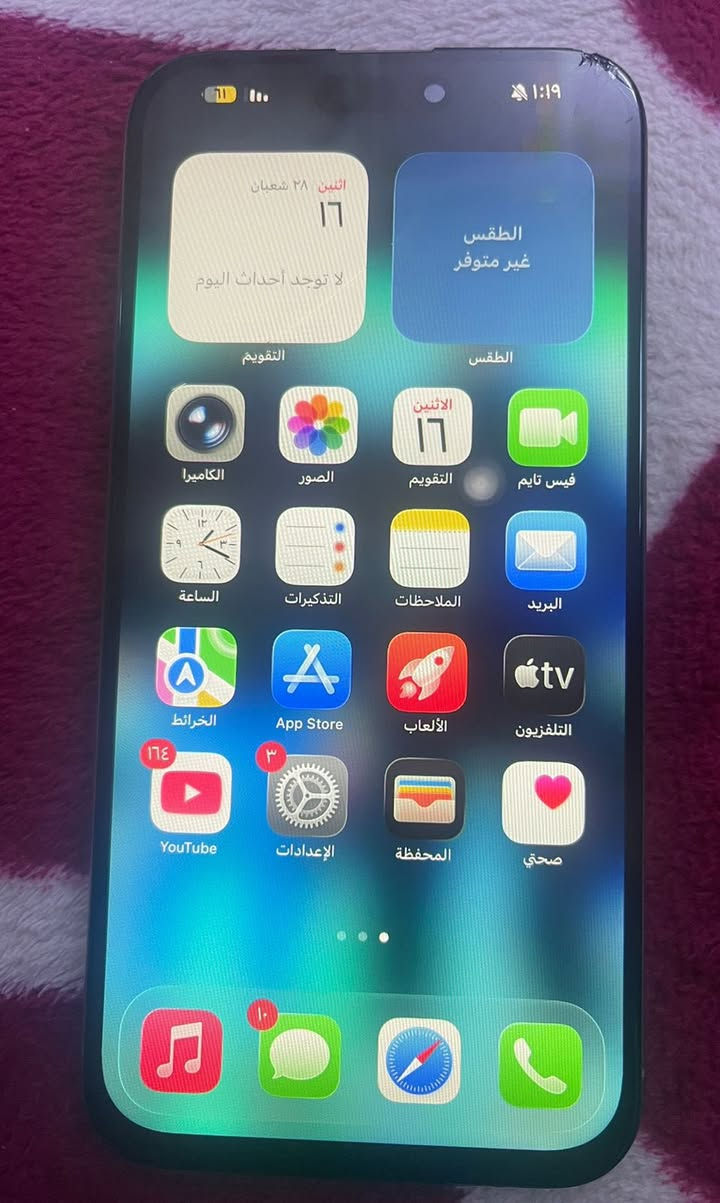 آيفون ١٥ برو ماكس شرق اوسط ذاكره ٢٥٦ بطاريه ١٠٠ جهاز مبدل شاشه اصليه وفيس إيدي شغال وبيه هاي ثلمه من فوك ممبينه وضهر مفطر اثر طيحه غراضه كامله سعره ٦٠٠ مع مجال *********** مكان نجف