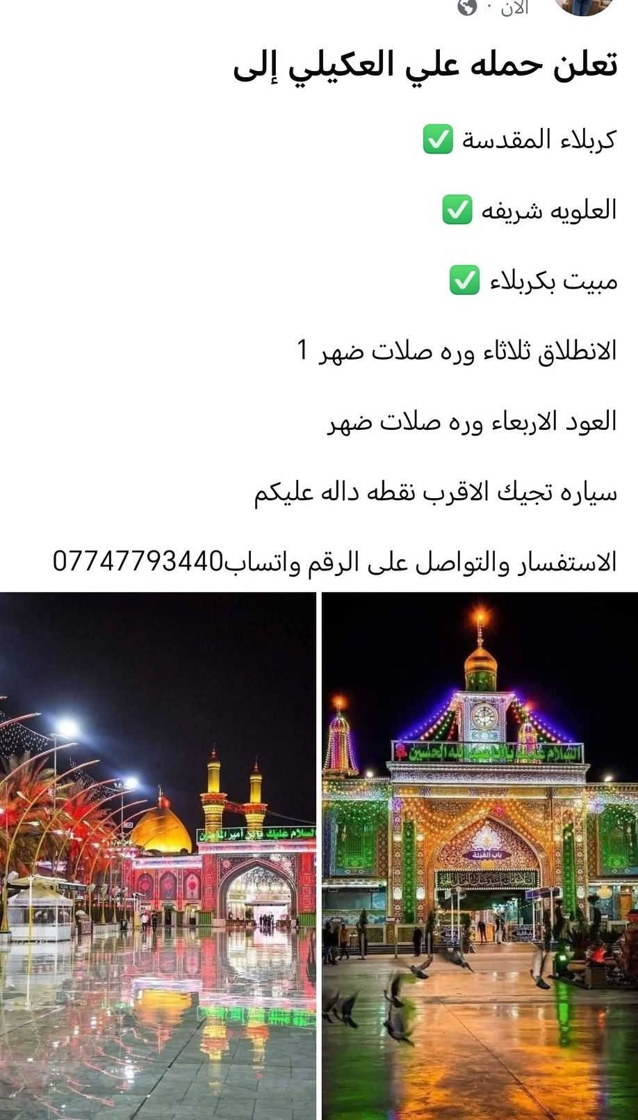 تعلن حمله علي العكيلي إلى كربلاء المقدسة ✅ العلويه شريفه ✅ مبيت بكربلاء ✅ الانطلاق ثلاثاء وره صلات ضهر 1 العود الاربعاء وره صلات ضهر سياره تجيك الاقرب نقطه داله عليكم الاستفسار والتواصل على الرقم واتساب***********