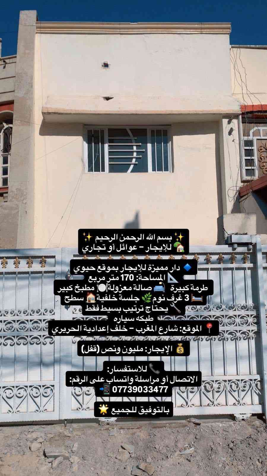 ✨ بسم الله الرحمن الرحيم ✨ 🏡 للإيجار – عوائل أو تجاري 🔹 دار مميزة للإيجار بموقع حيوي 📐 المساحة: 170 متر مربع طبكه سياره طرمة كبيرة🛋 صالة معزولة🍽 مطبخ كبير🛏 3 غرف نوم🌿 جلسة خلفية🏠 سطح 🔧 يحتاج ترتيب بسيط فقط 📍 الموقع: شارع المغرب – خلف إعدادية الحريري 💰 الإيجار: مليون ونص (قفل) 📞 للاستفسار: الاتصال أو مراسلة واتساب على الرقم: 📲 *********** بالتوفيق للجميع 🌟